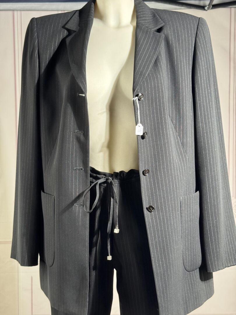 BETTY BARCLAY - Tailleur pantalon en drap de laine noir à fines rayures, veste petit col, simple boutonnage, manches longues, deux poches plaquées et pantalon à pinces, lacet à la taille. Taille indiquée 40 Peu porté, très bon état général