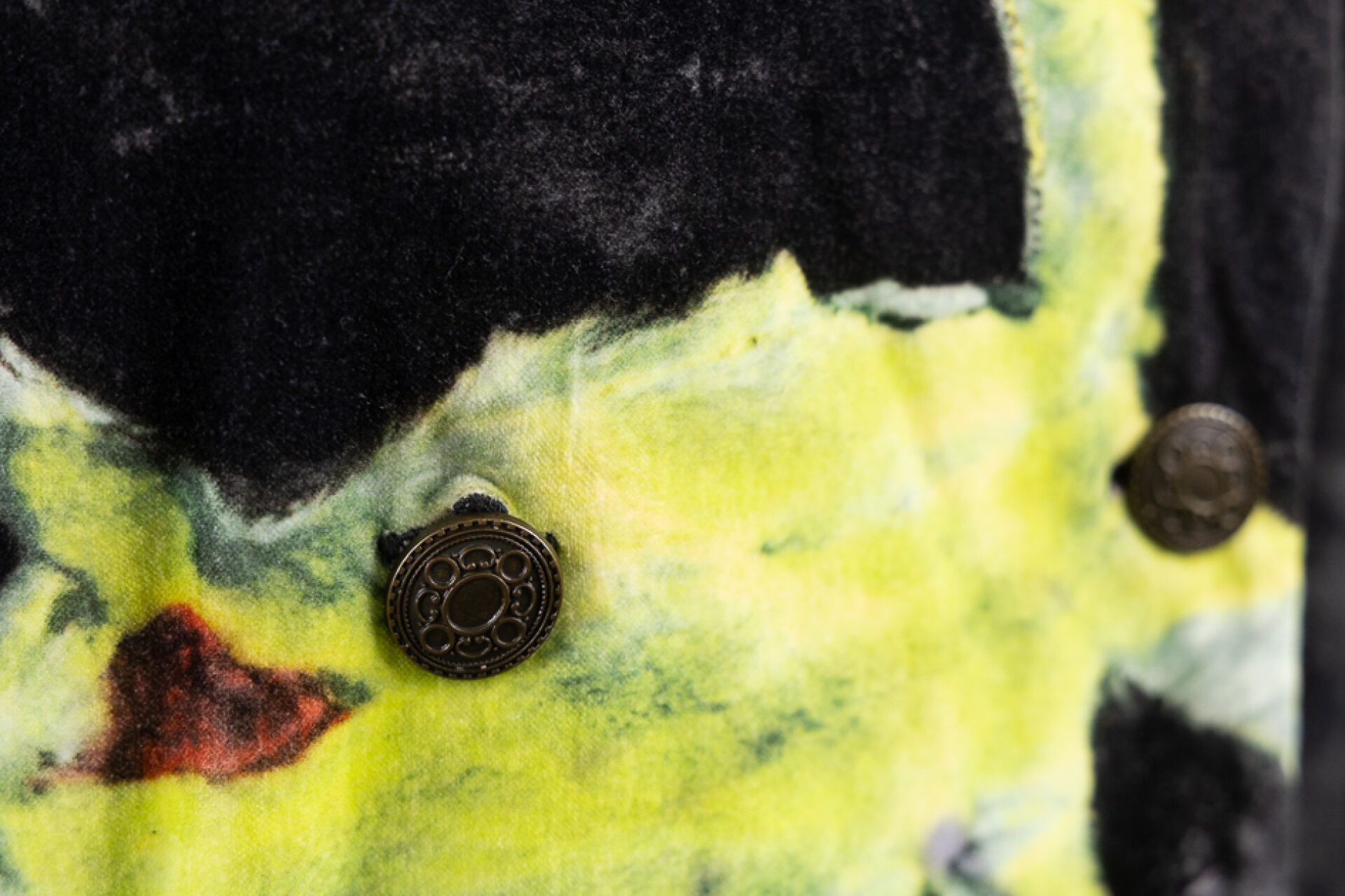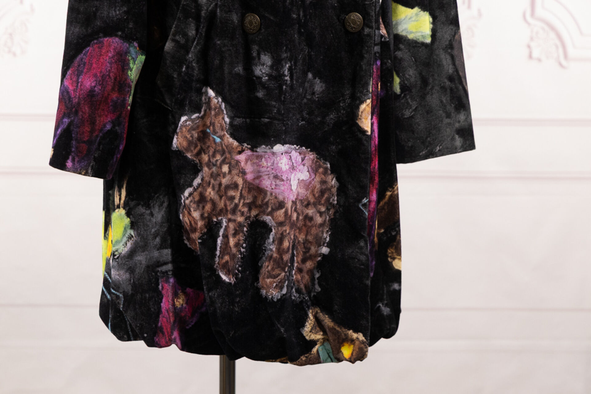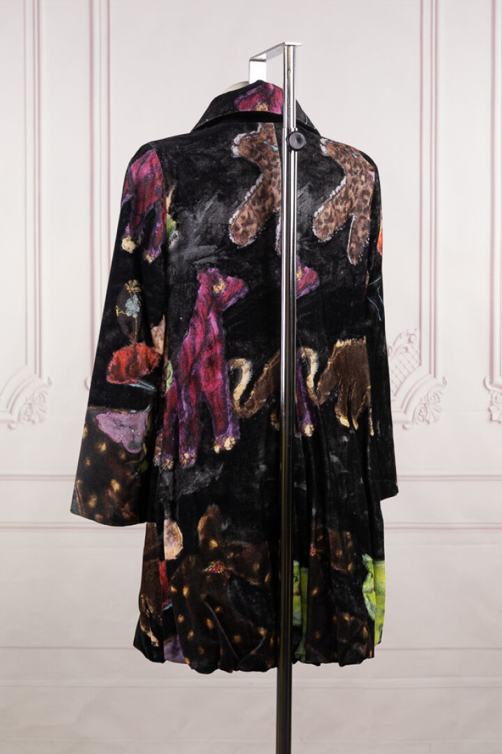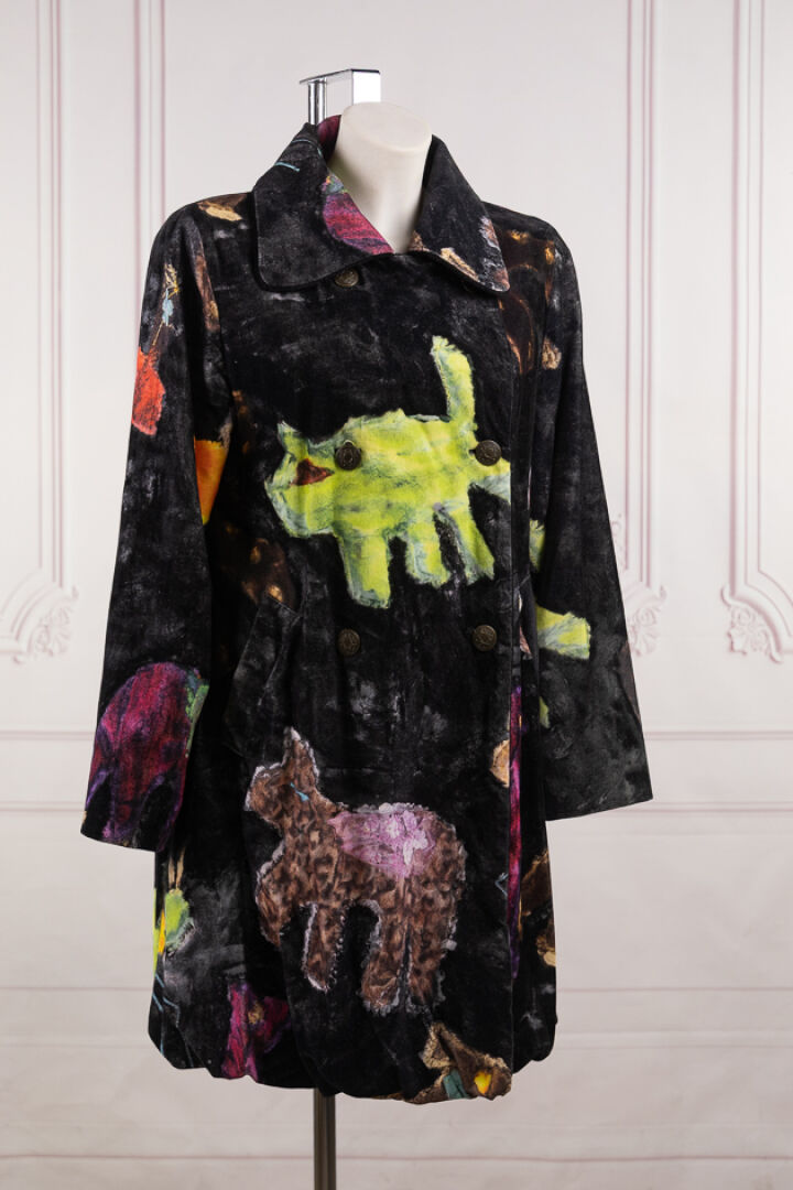 LOUISE DELLA - Manteau de forme évasée, coton imprimé de motifs colorés sur fond noir, petit col, double boutonnage, deux poches en biais, manches longues. Taille indiquée 2 Très bon état