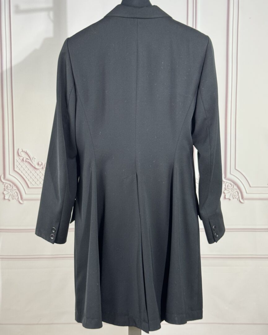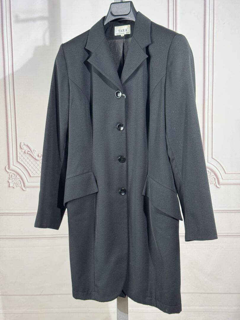 TARA - Redingote noire, deux poches sous rabat, simple boutonnage, manches longues. Taille indiquée 2 Déjà portée, bon état général