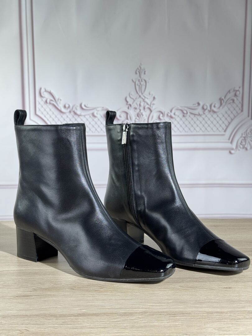 CAREL - Paire de bottines modèle "Estime Bis", cuir agneau noir et bout vernis à la couleur, petit talon. Pointure 39 - Haut du talon : 5 cm Etat neuf