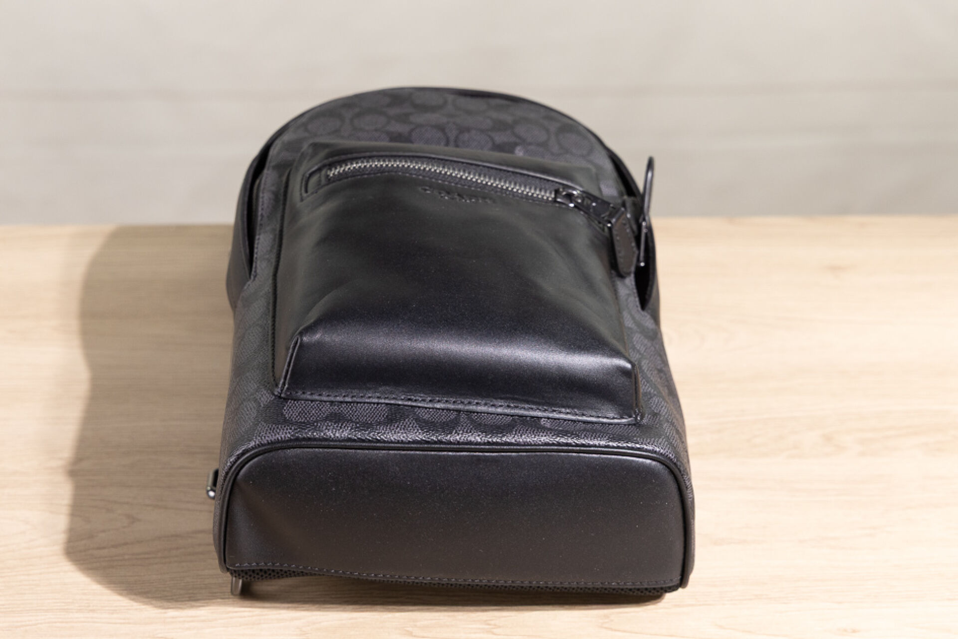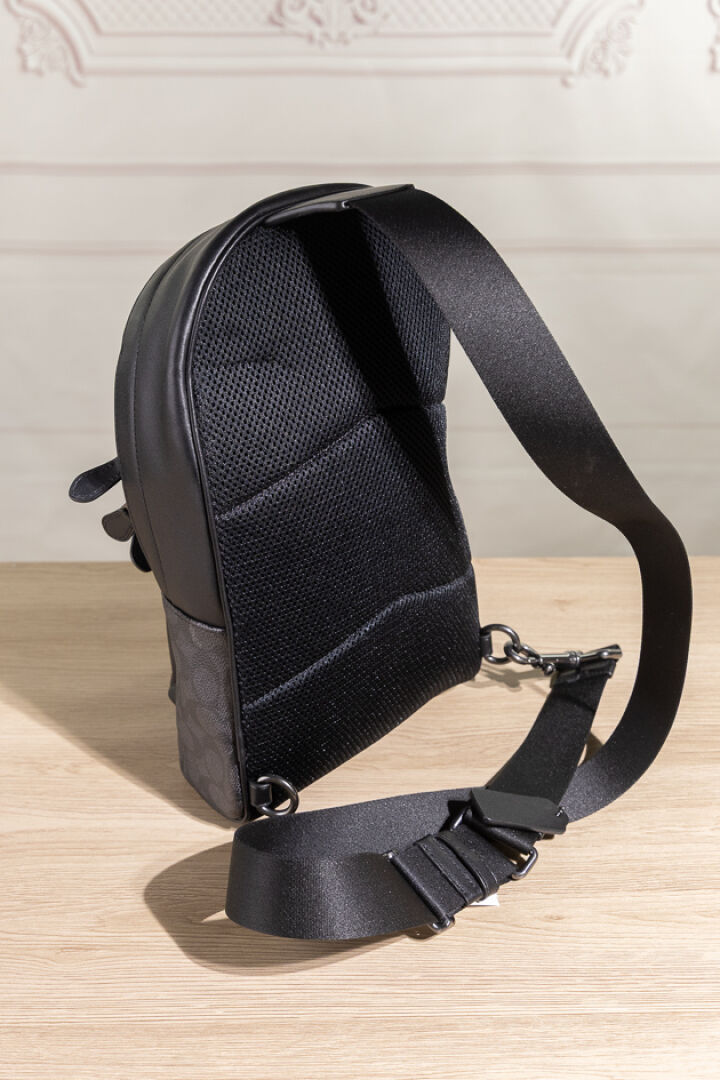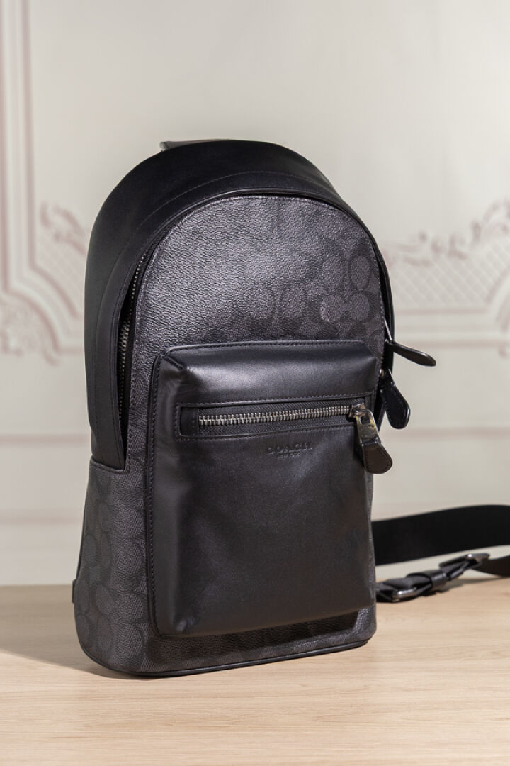 COACH - Sac à dos en toile enduite siglée graphite et cuir noir, poche plaquée zippée devant, compartiment principal également zippé, une anse à dos transformable à volonté. Haut. : 30 cm - Long. : 20 cm Non porté