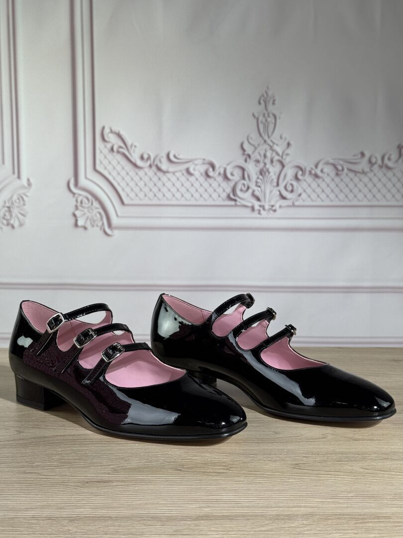 CAREL - Paire de souliers, modèle "Ariana", cuir agneau noir vernis, trois brides, petits talons. Pointure 38 - Haut du talon : 2,5 cm Etat neuf