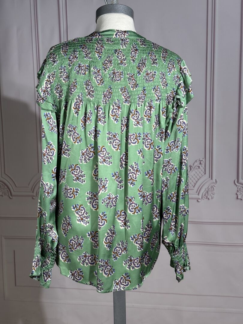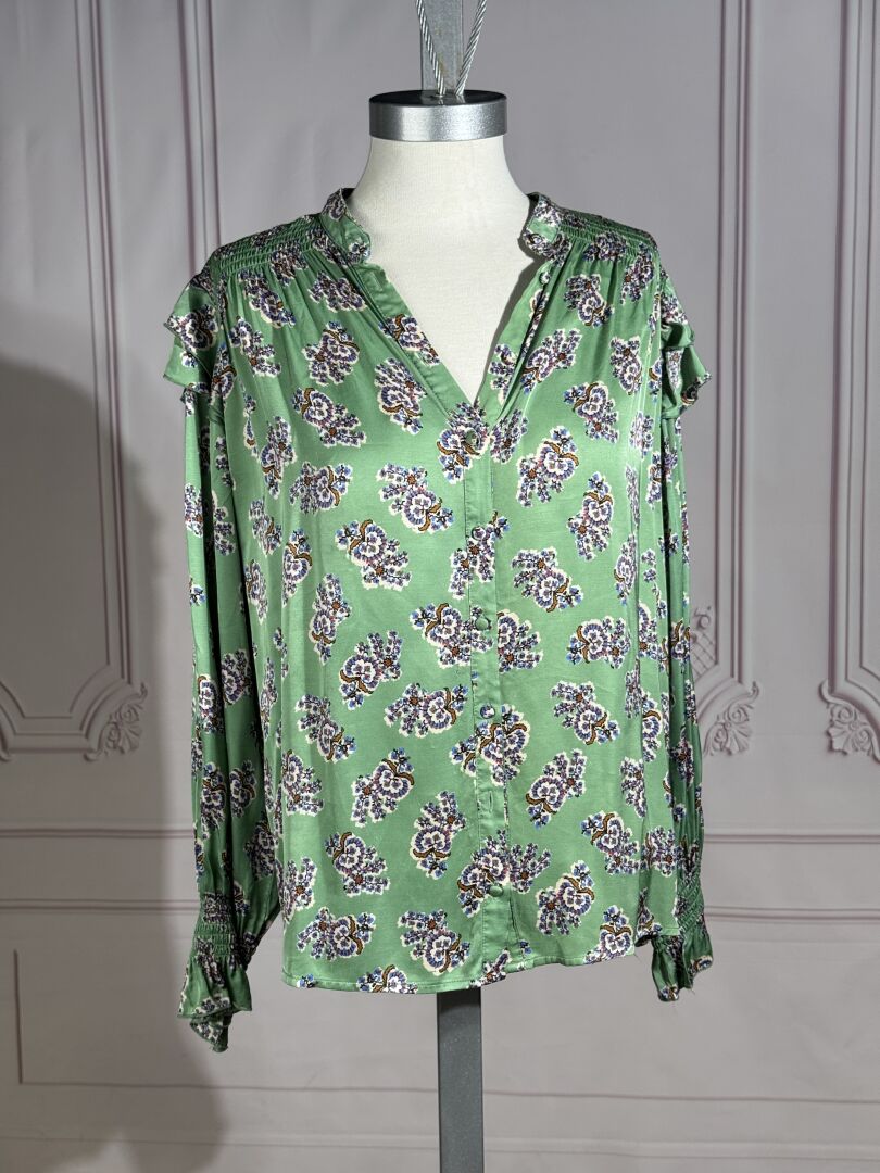 BERENICE - Blouse en viscose verte pistache imprimé de fleurs, simple boutonnage, manches longues, volanté aux épaules. Taille supposée 38 Déjà portée, petites bouloches