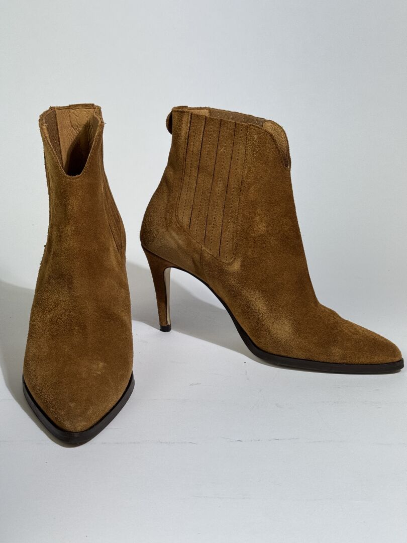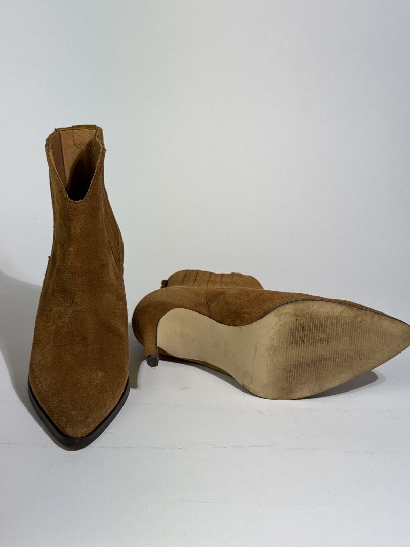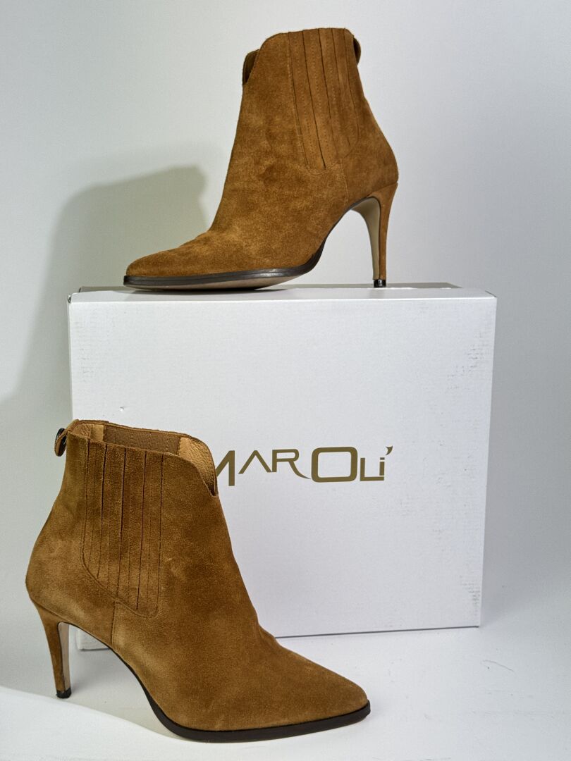 MAROLI - Paire de bottines à talon, bouts pointus, daim Camel. Boite. Pointure 39 - Haut du talon : 9 cm Peu portées, très bon état