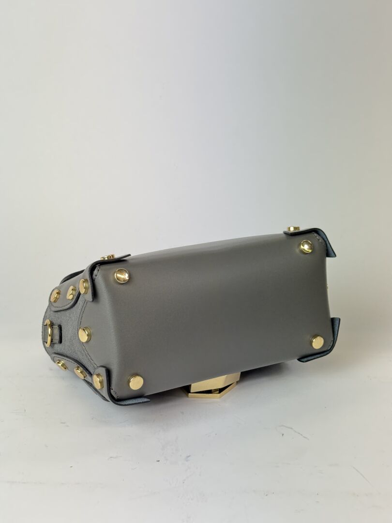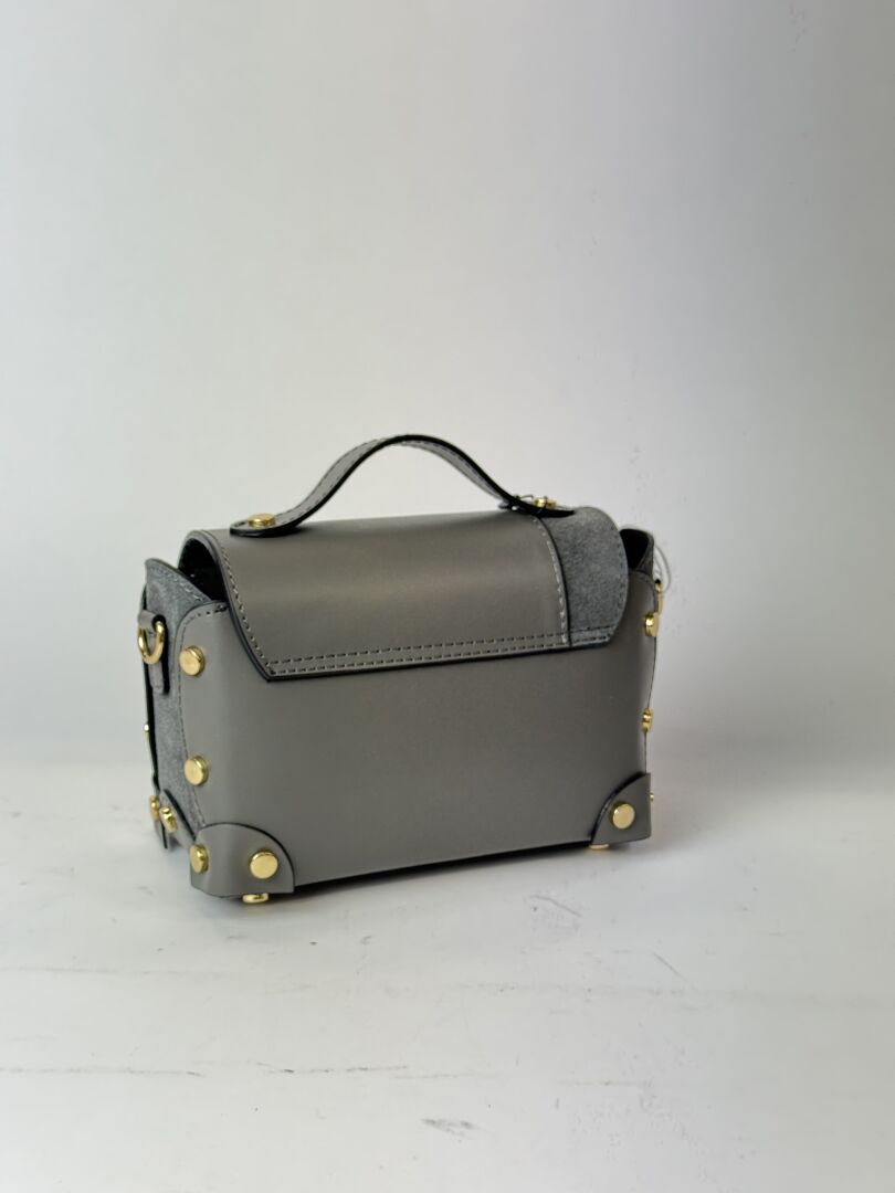 CHRISTIAN LAURIER - Sac à main à rabat en cuir et cuir retourné gris, accastillage métal doré, anse à main et anse bandoulière à la couleur. Haut. : 15 cm - Long. : 20 cm Etat magasin
