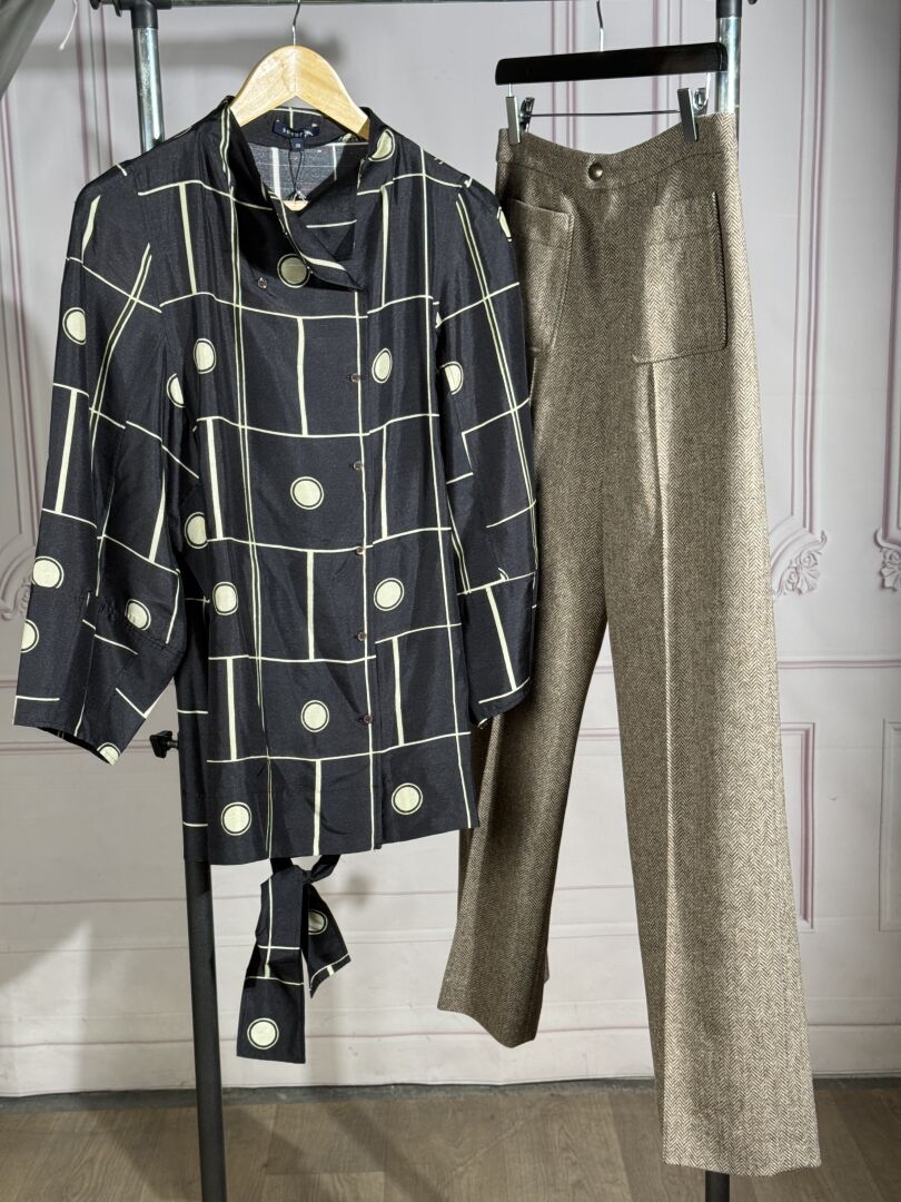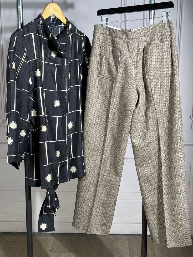 SOEUR - Ensemble comprenant un pantalon large en lainage chiné beige et écru et un chemisier modèle "Bangkok" noir et écru, manche longues, ceinture. Taille 38 Etat magasin