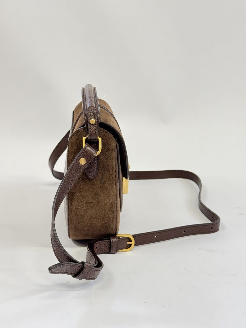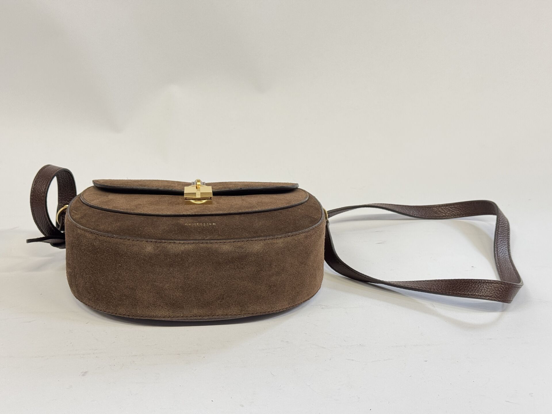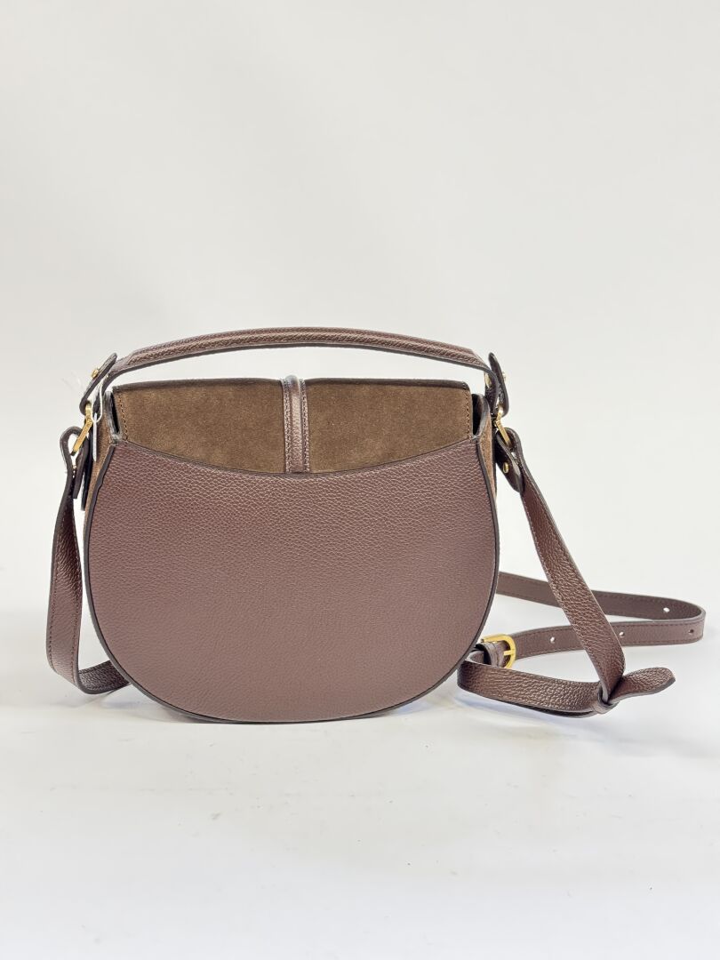DEMELLIER - Sac à main à rabat en cuir grainé et cuir retourné chocolat, accastillage métal doré, anse bandoulière. Haut. : 20 cm - Long. : 20 cm Etat magasin