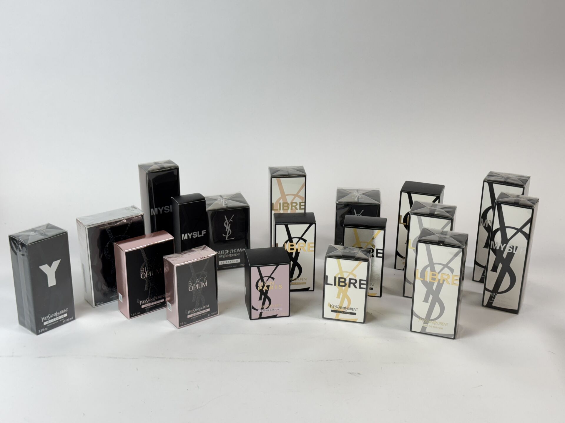 YVES SAINT LAURENT - Ensemble comprenant 17 flacons dont My Self, La Nuit de l'Homme, Black Opium, Libre,… Parfum, eau de parfum et eau de toilette. Diverses contenances