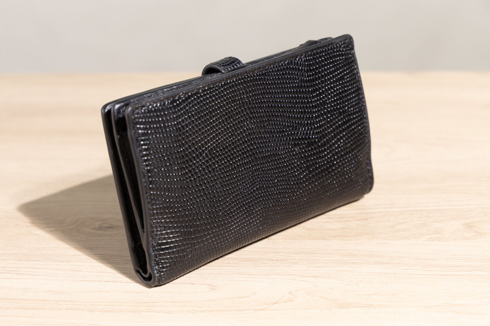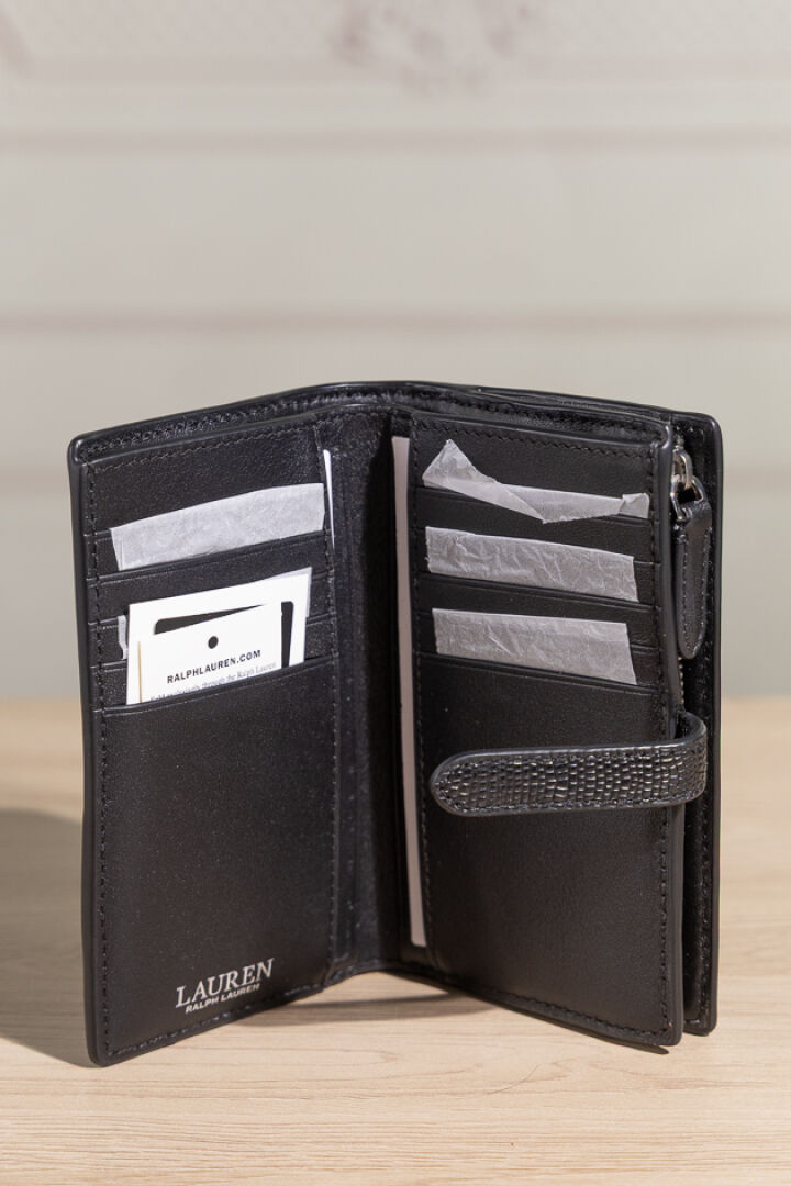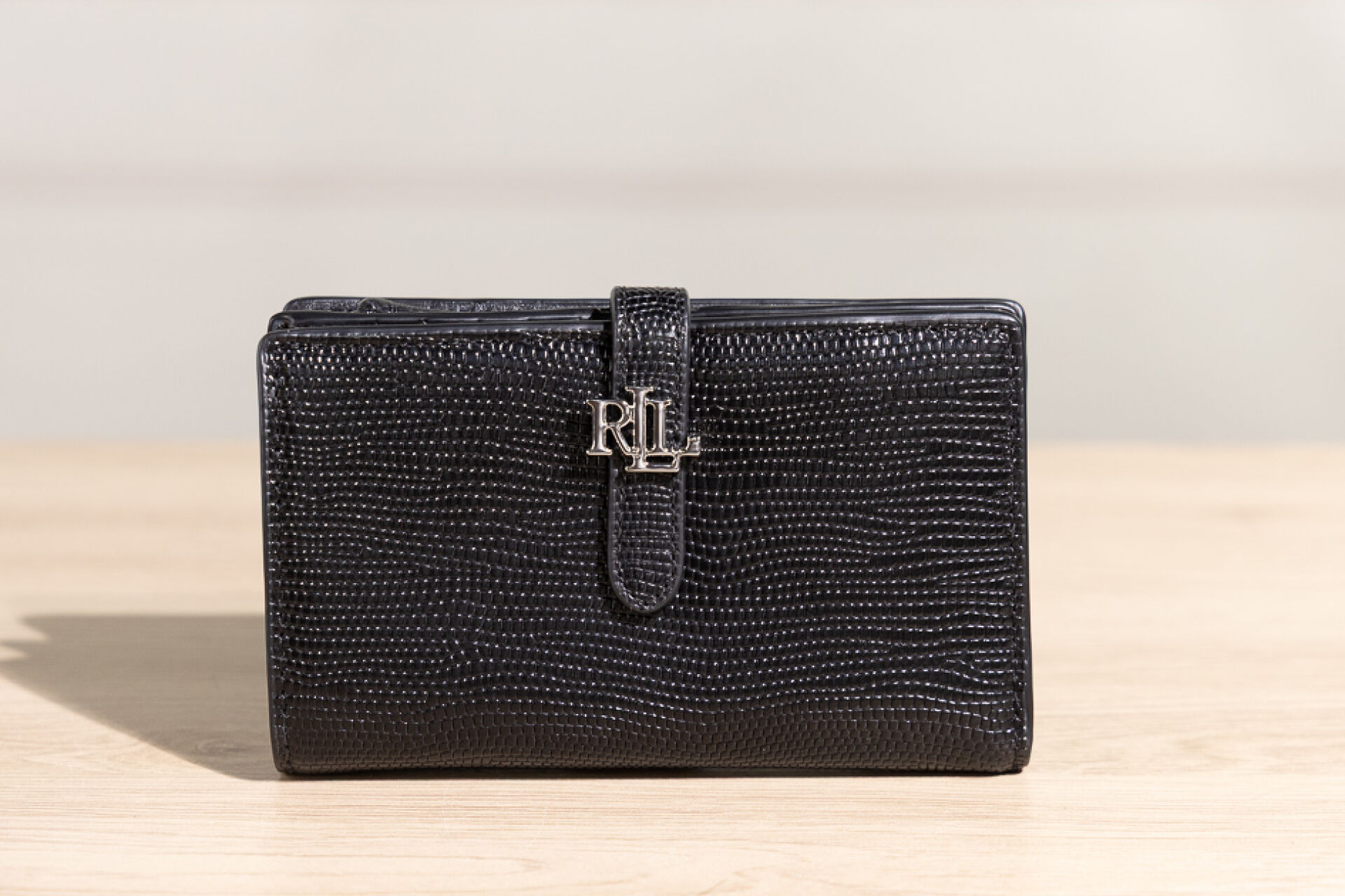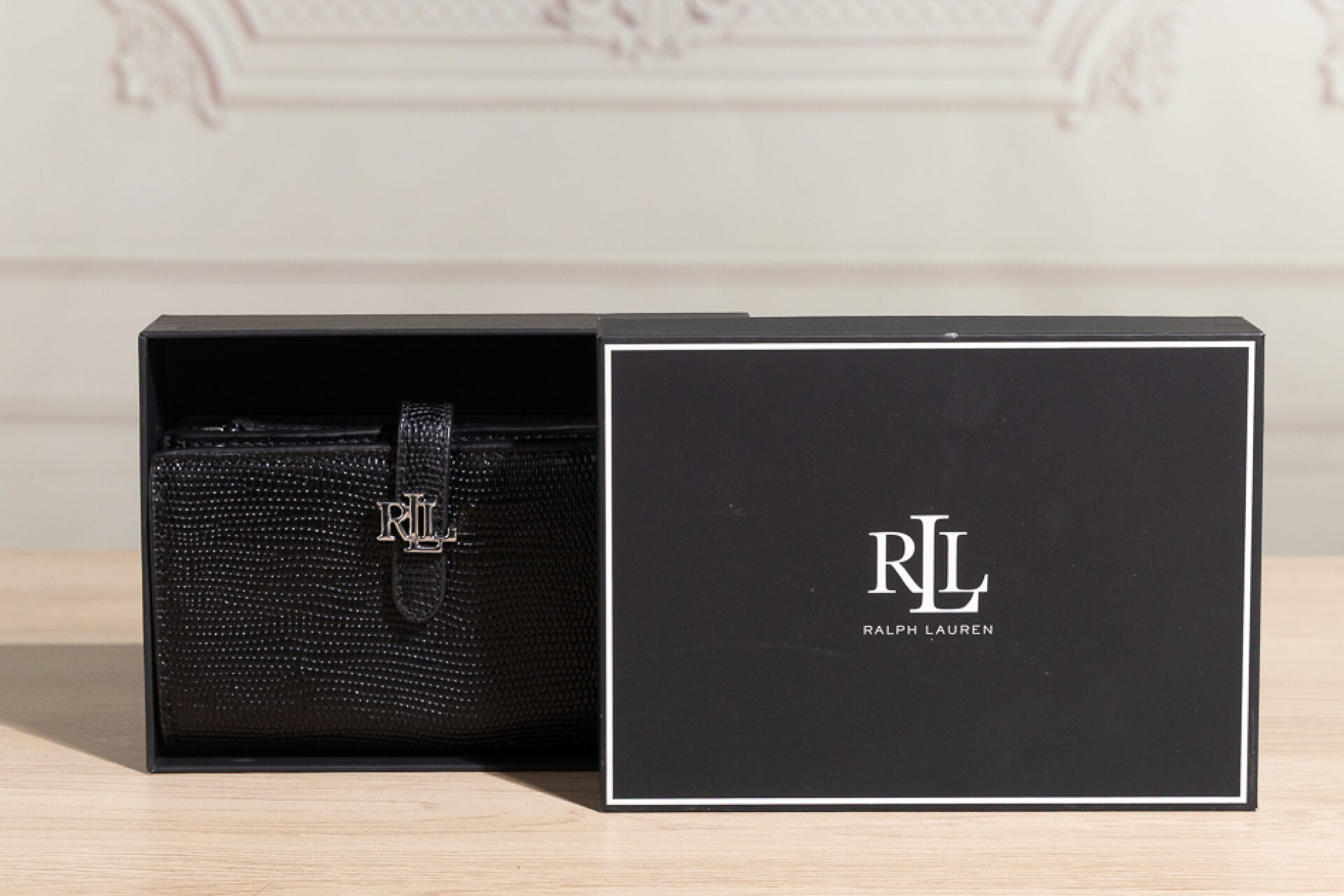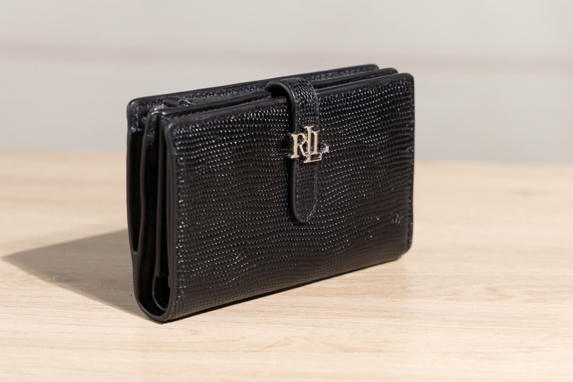 RALPH LAUREN - Porte feuille en cuir imitation lézard noir, fermeture à glissière et languette. Haut. : 9 cm - Long. : 14,5 cm Etat magasin
