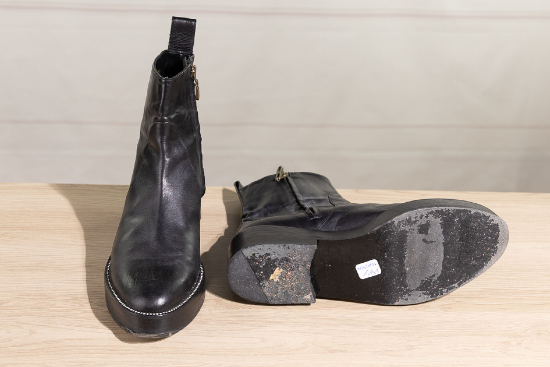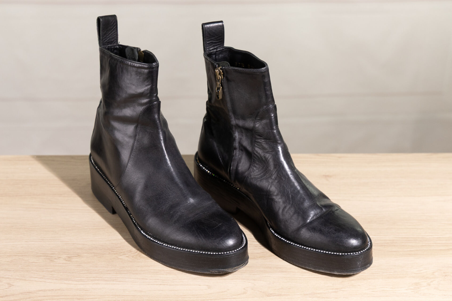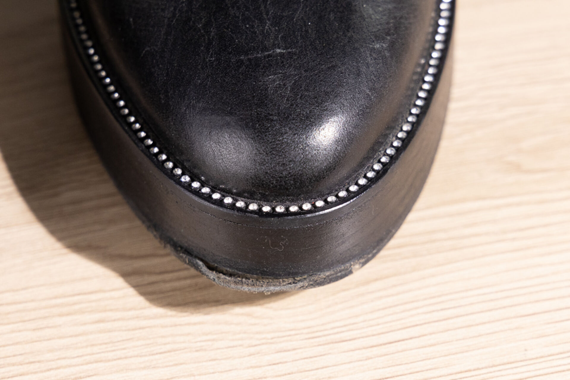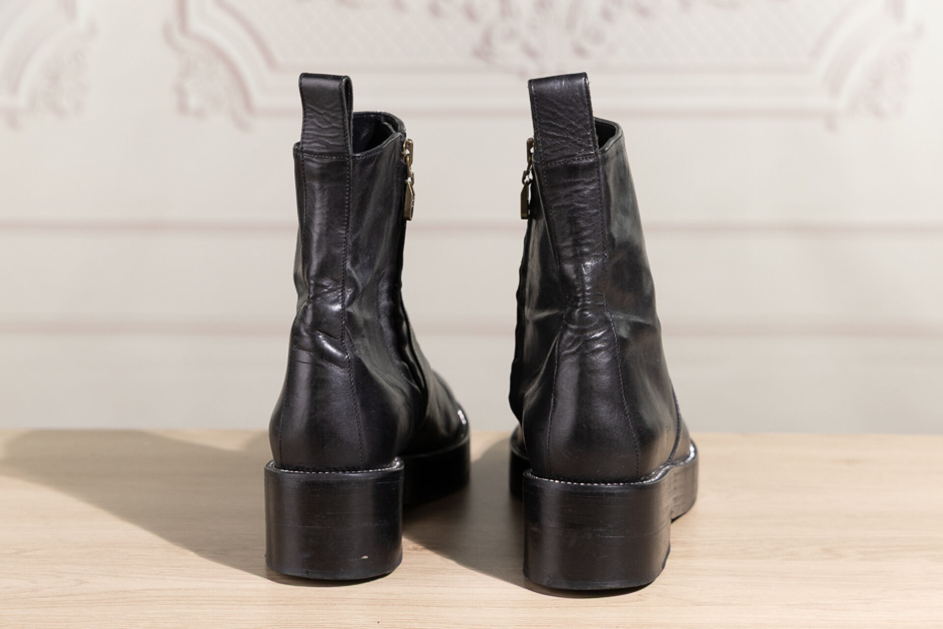 SONIA RYKIEL - Paire de bottines en cuir noir, semelles rehaussées de strass en tour de pied, fermeture latérale. Pointure 37,5 (usures, déjà portées)