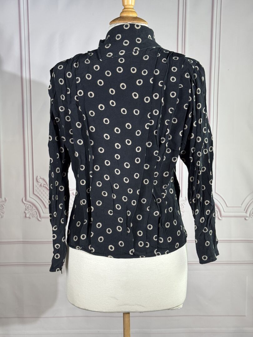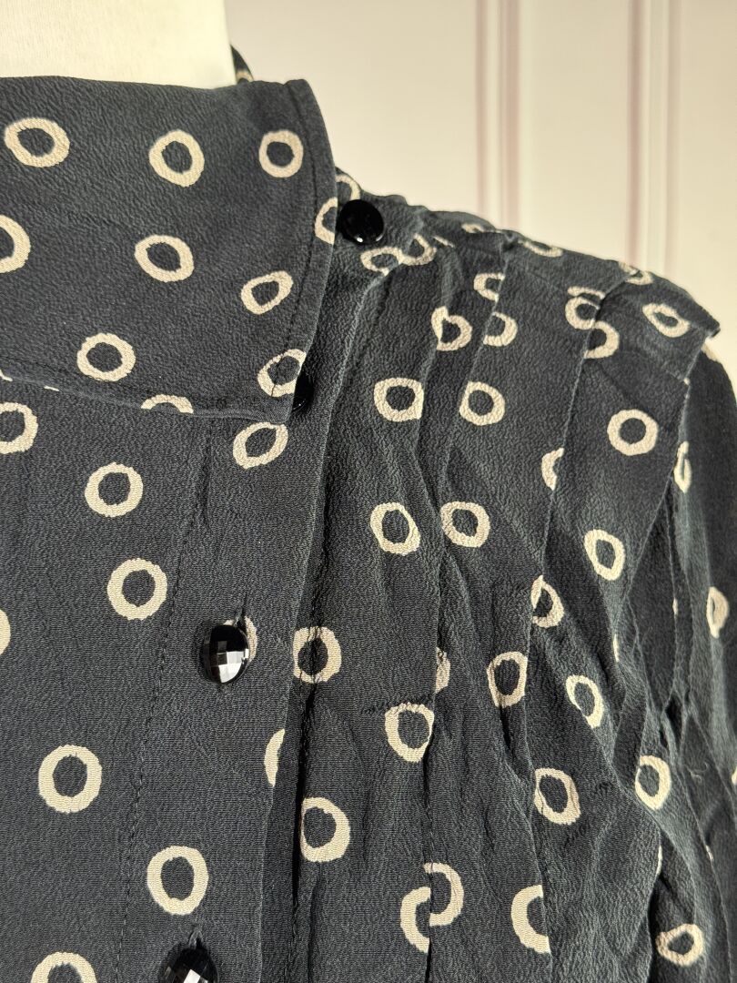 UNGARO PARALLELE - Haut en tissu noir imprimé d'œillets beiges, boutonnage asymétrique et plis plats, manches longues zippées. Taille supposée 36 Déjà porté, bon état général