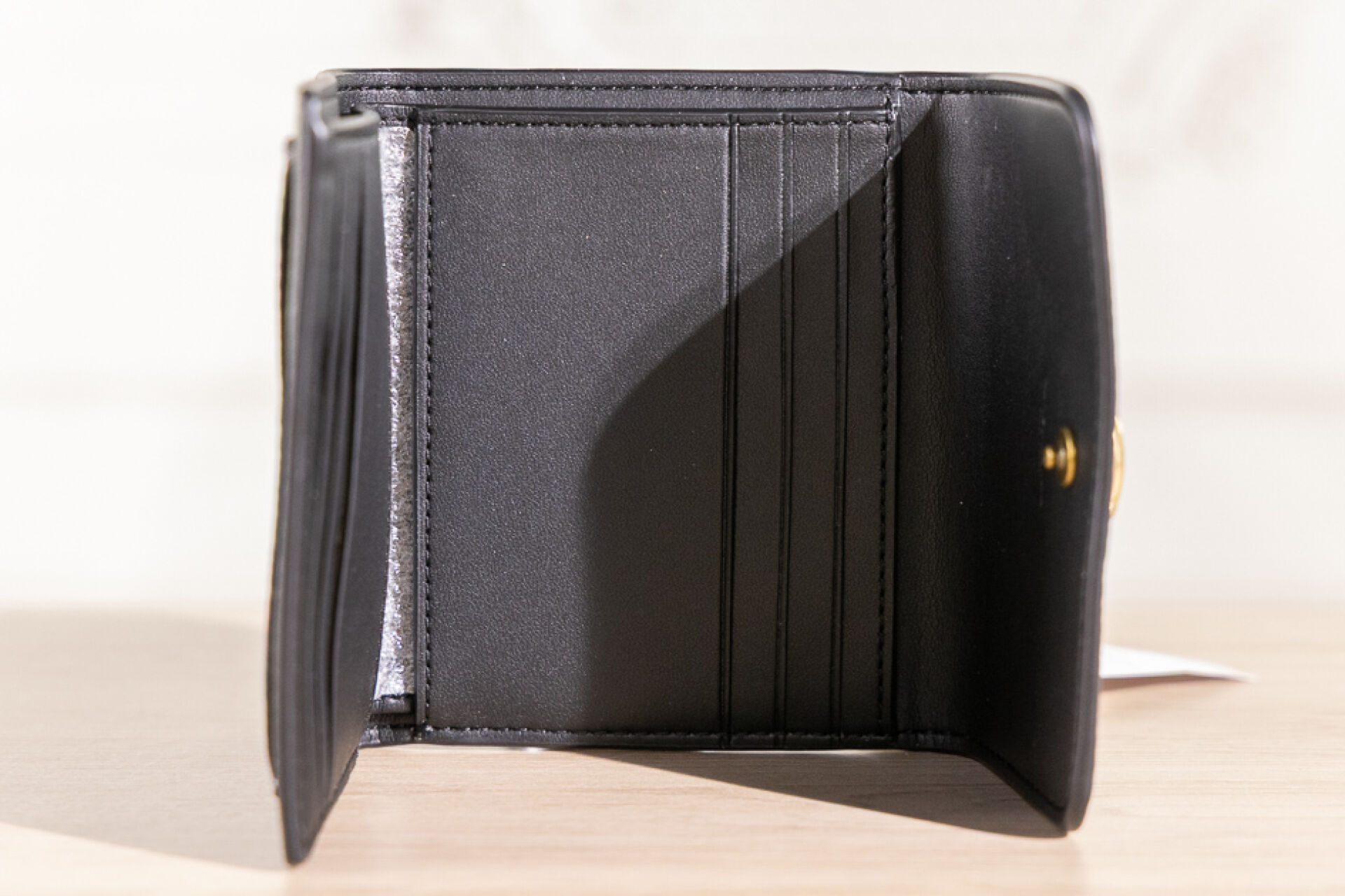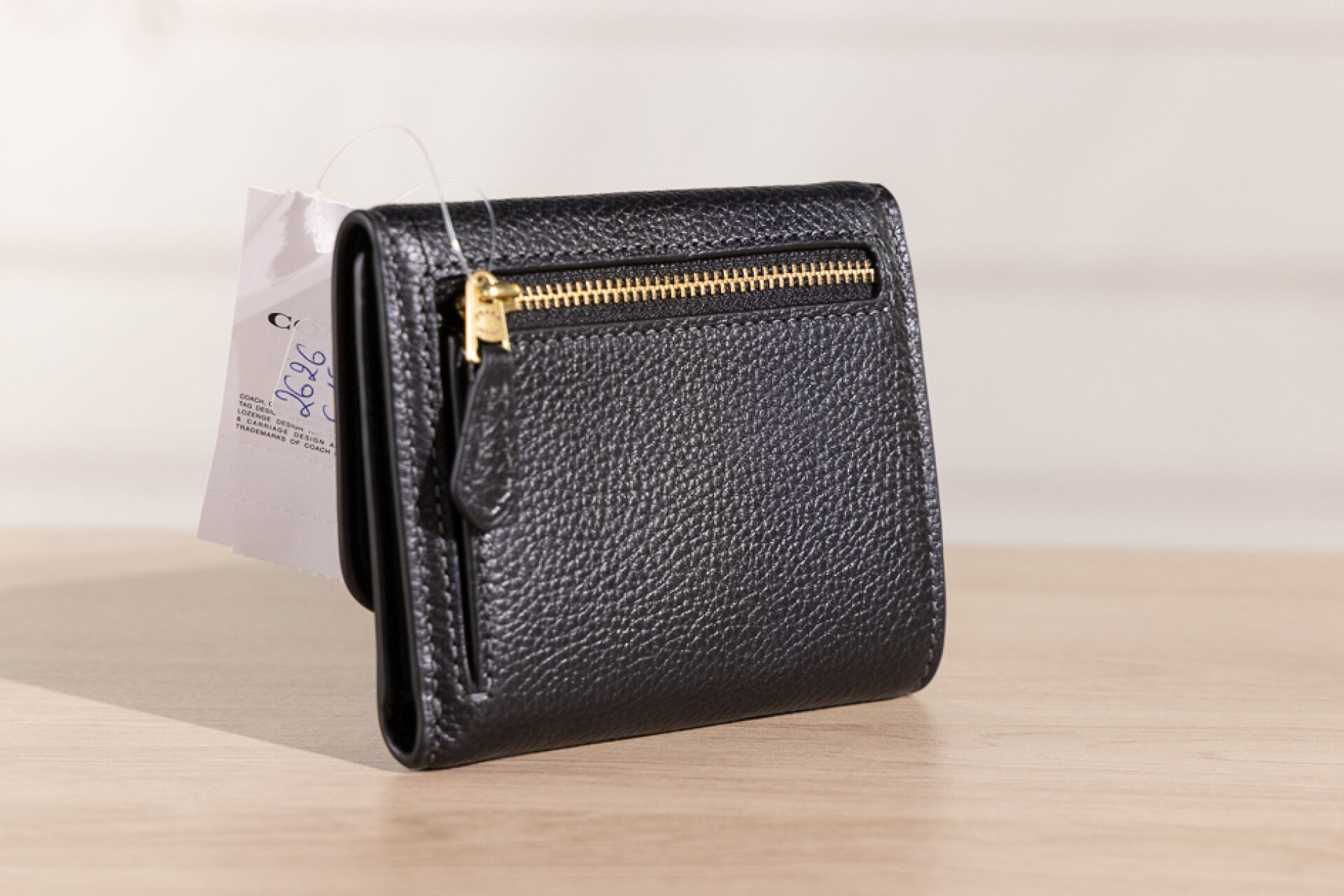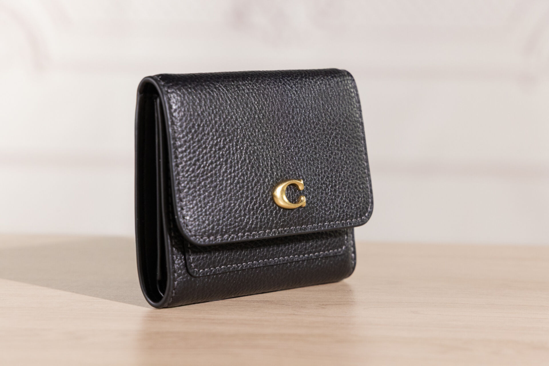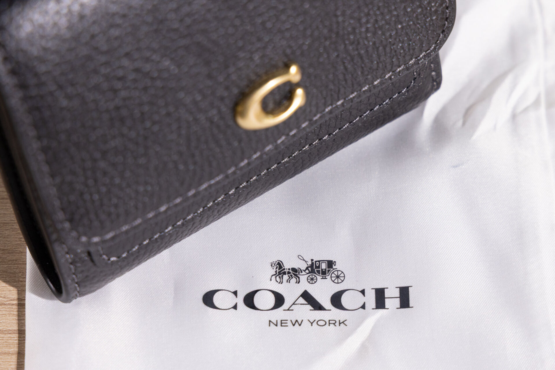 COACH. Porte cartes en cuir grainé noir, fermoir pression sous rabat. H10xL11cm. Etat neuf, étiquette d'origine!;