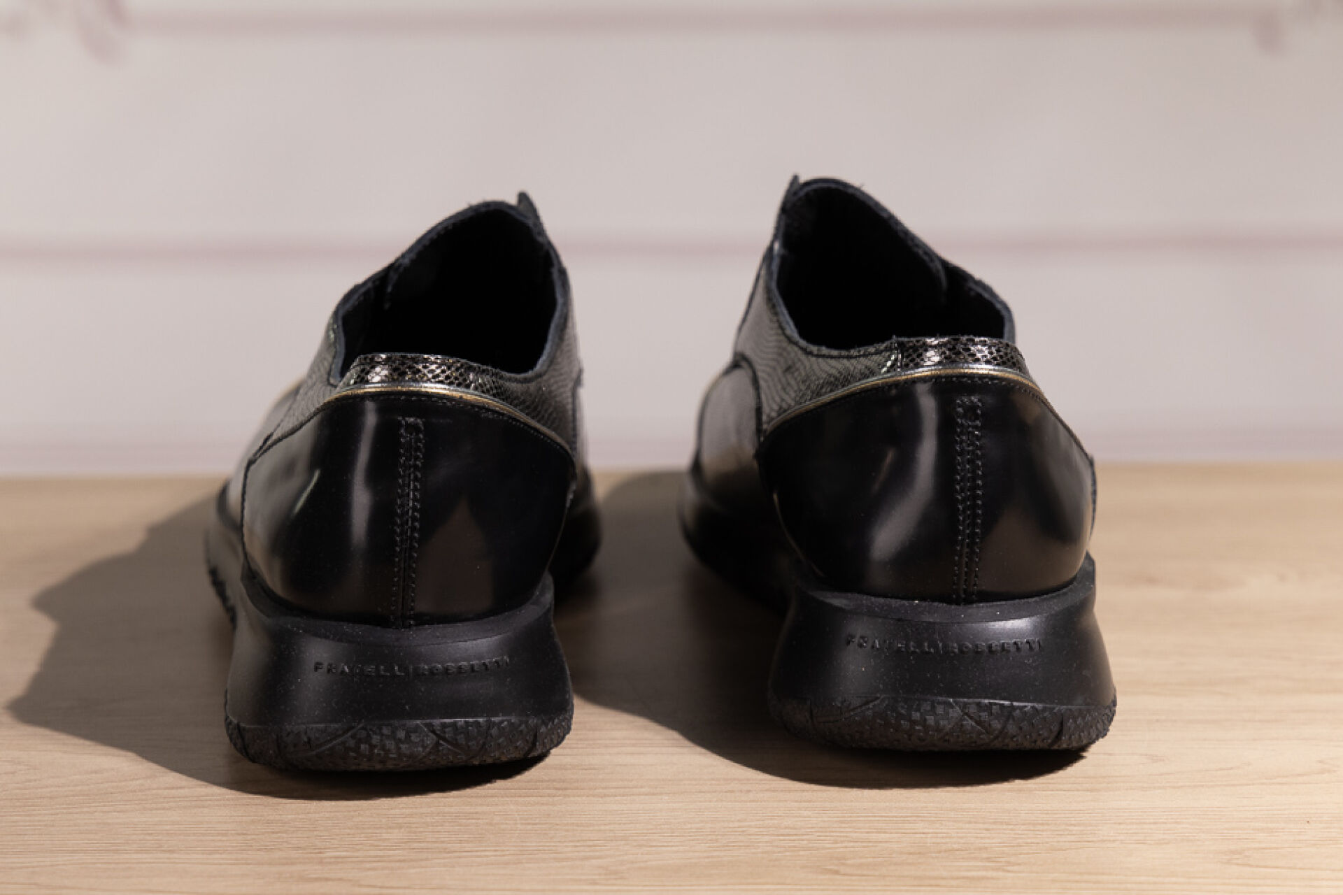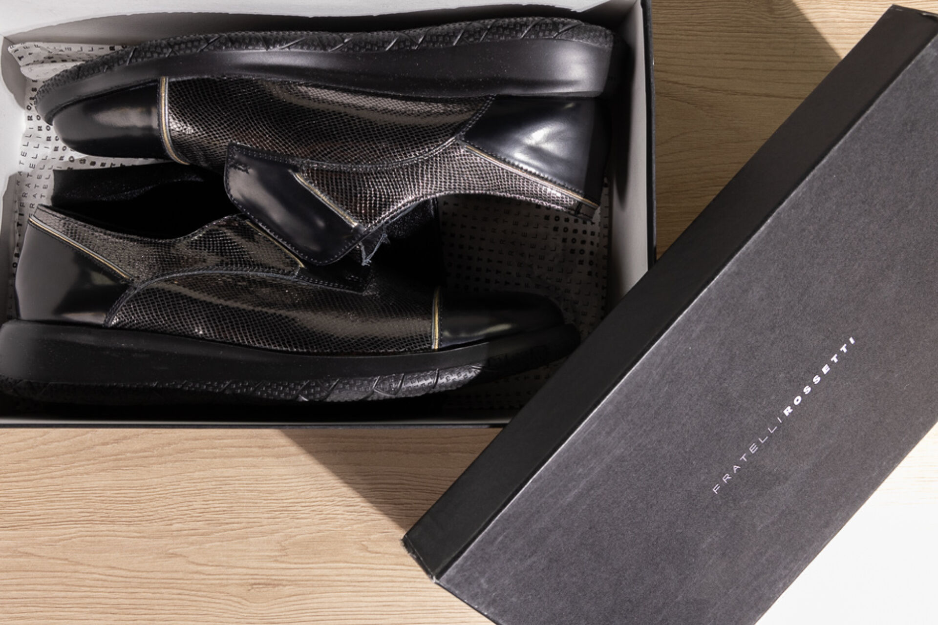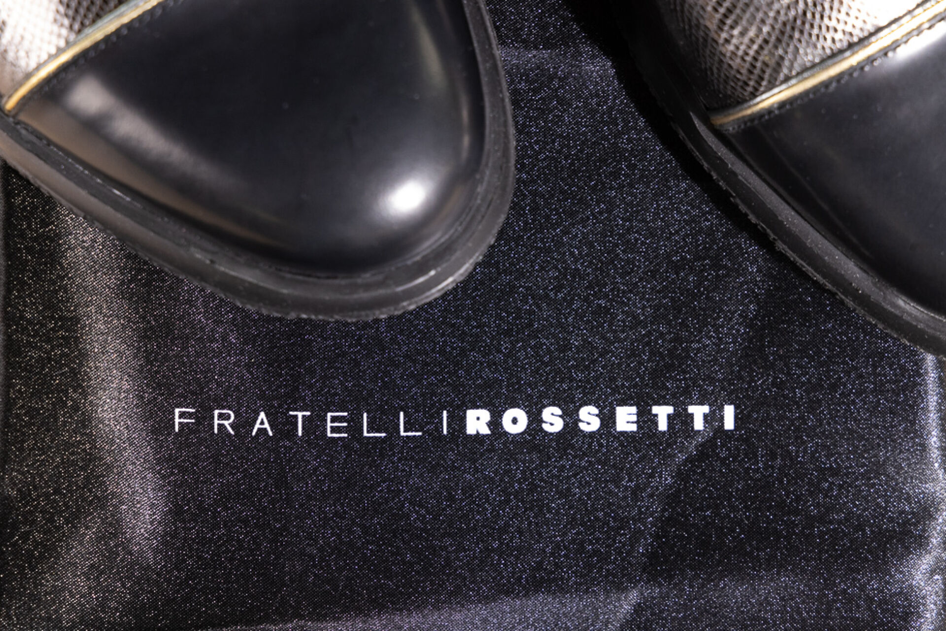 FRATELLI ROSSETTI. Paire de sleepers en cuir noir et doré reptilien. Pointure 41. Non portées, dans leur boite.