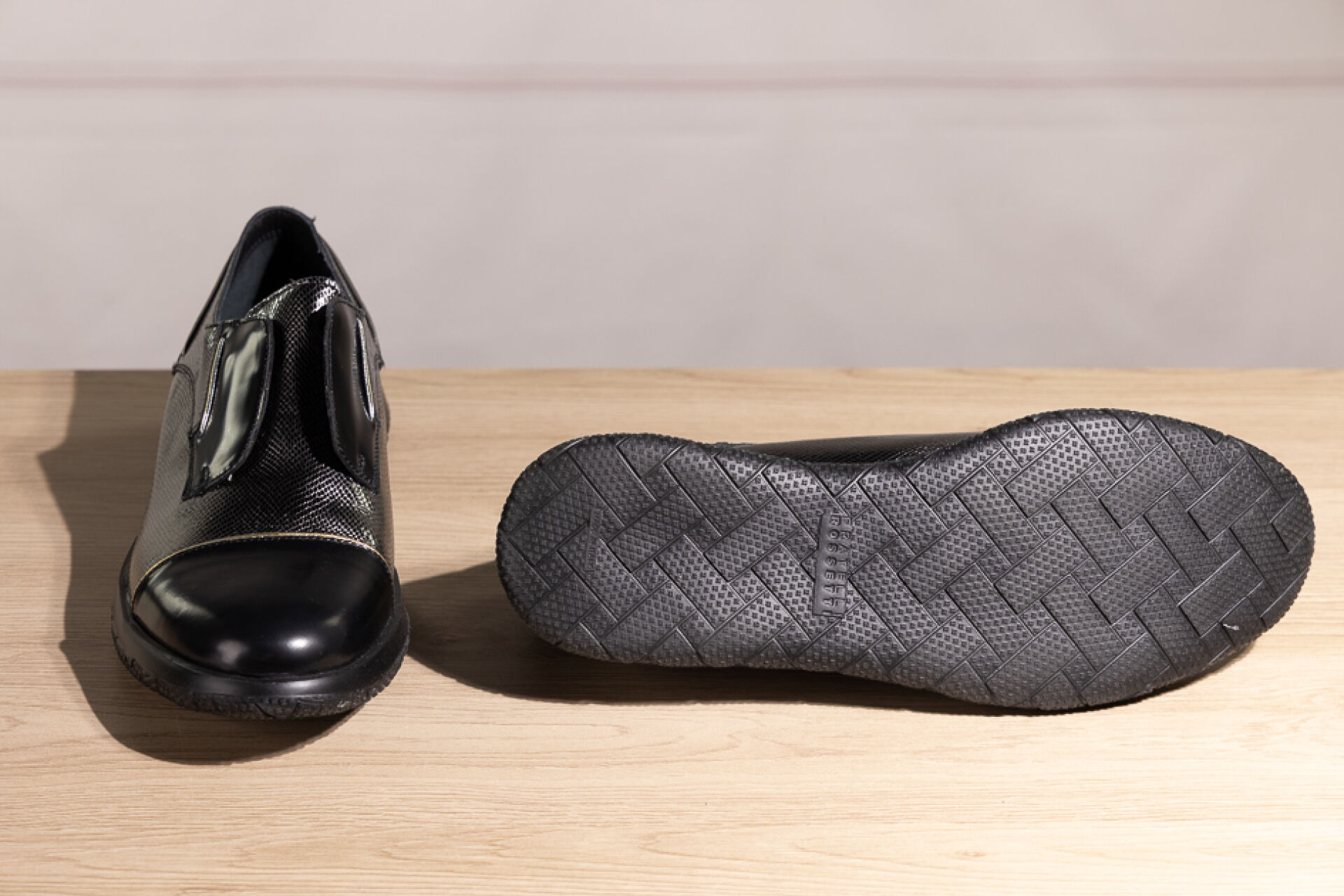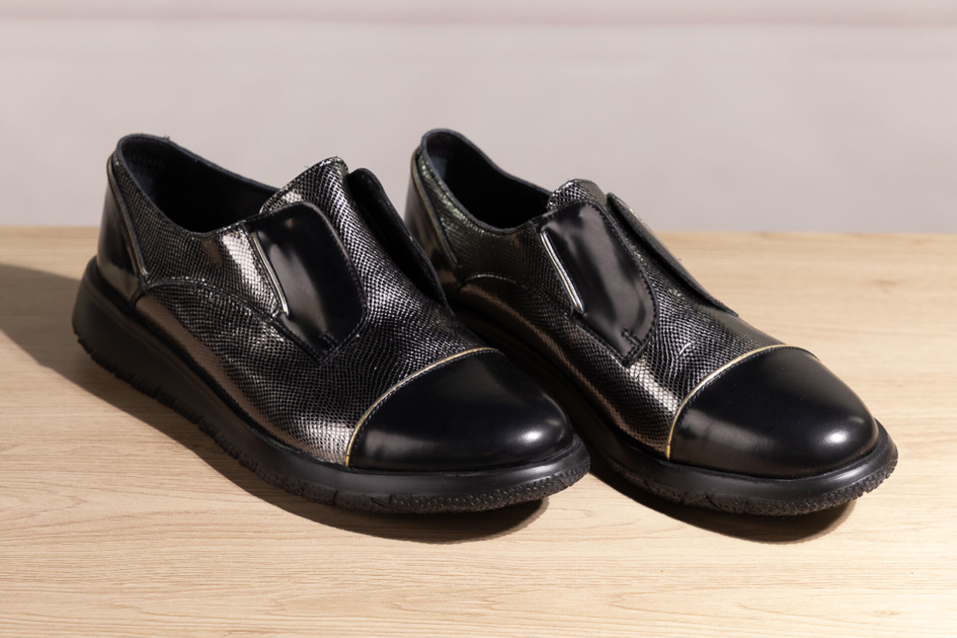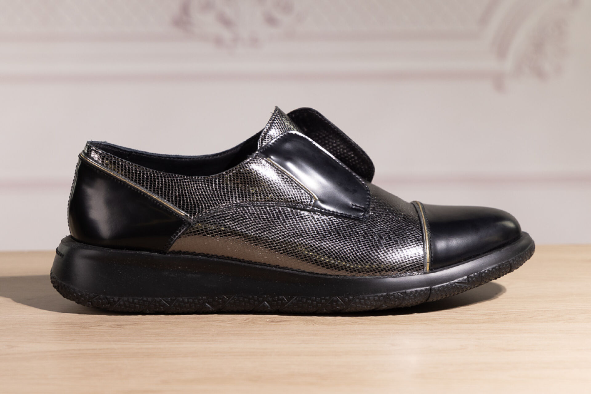 FRATELLI ROSSETTI. Paire de sleepers en cuir noir et doré reptilien. Pointure 41. Non portées, dans leur boite.