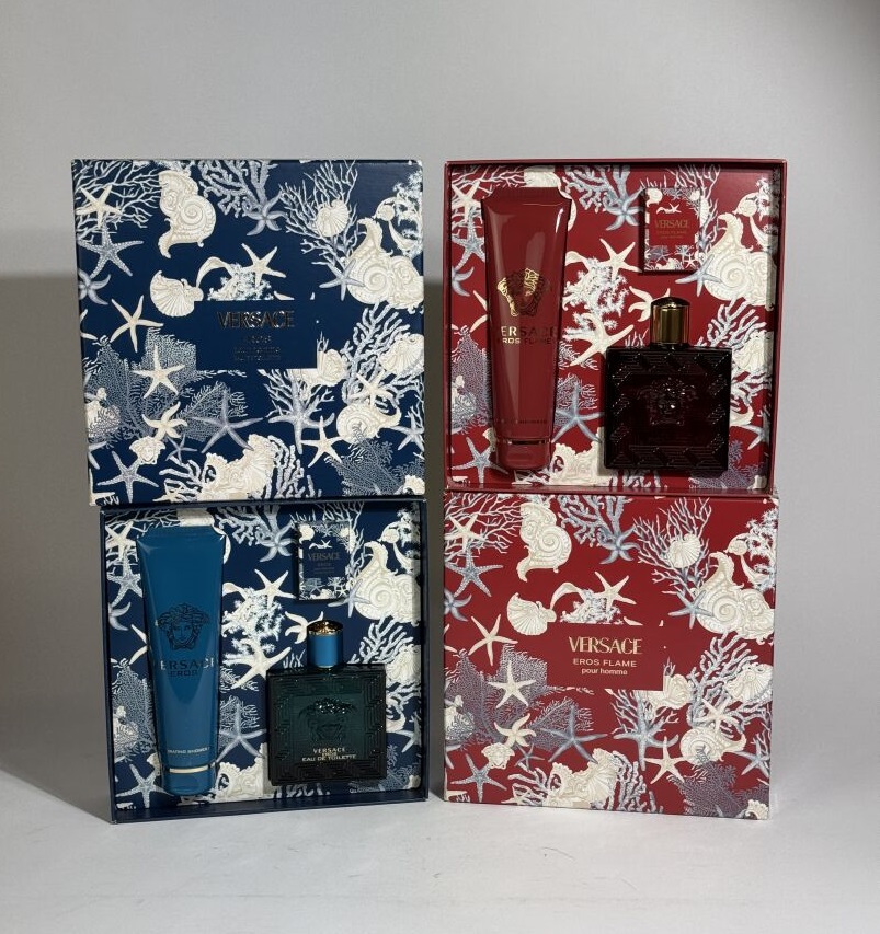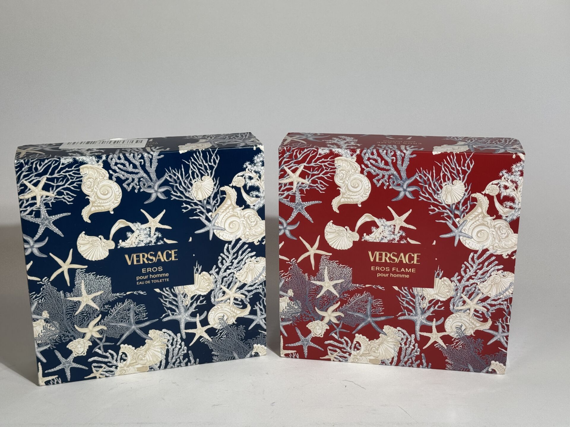 VERSACE - Deux coffrets : - "Eros Flame pour Homme" eau de parfum 100 ml et 5 ml et gel douche parfumé 150 ml ; - "Eros pour Homme" eau de toilette 100 ml et 5 ml et un gel douche parfumé 150 ml.