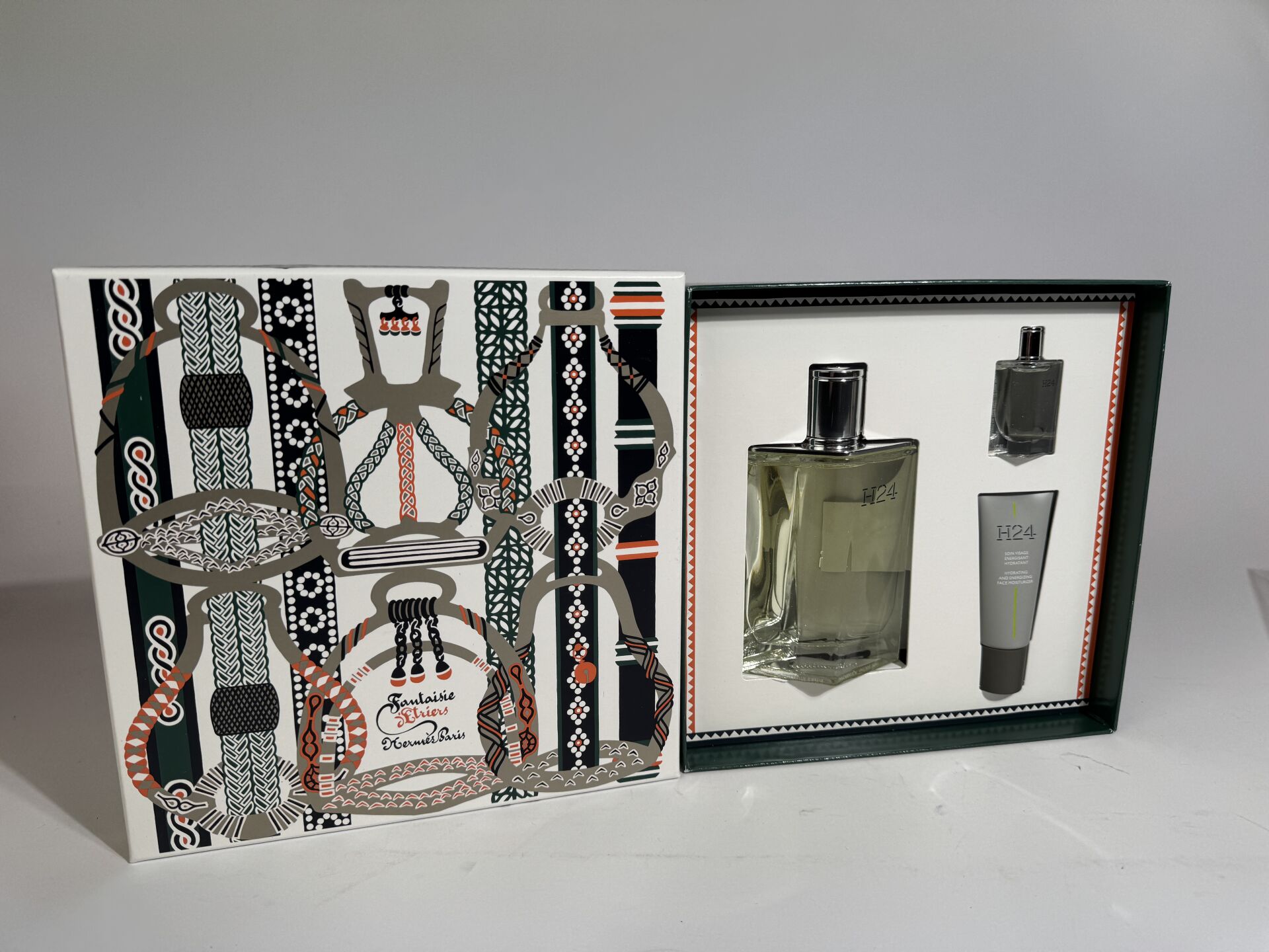 HERMES - Coffret comprenant une eau de toilette "H 24" 100 ml, une eau de toilette miniature 5 ml et un soin visage énergisant hydratant 20 ml.