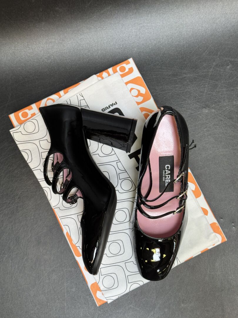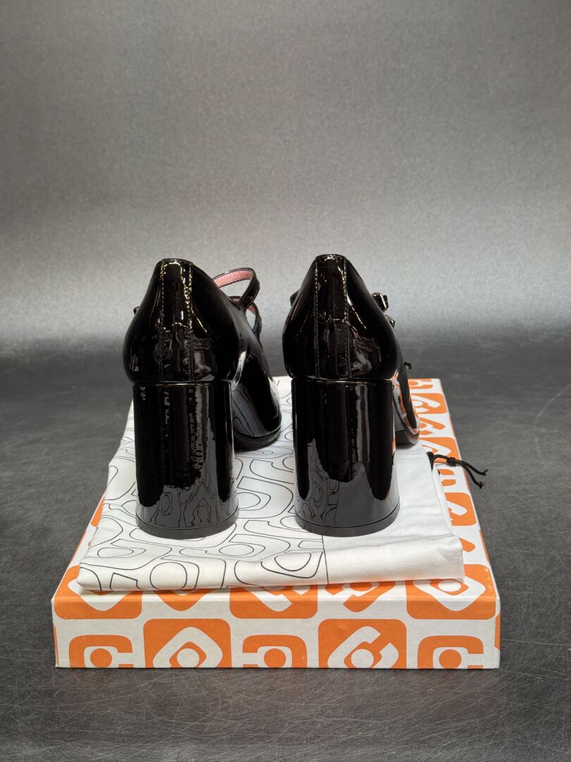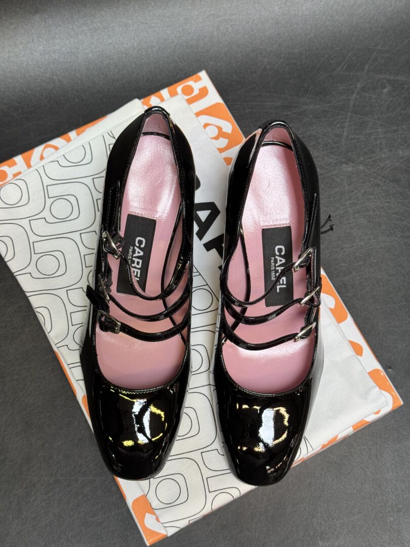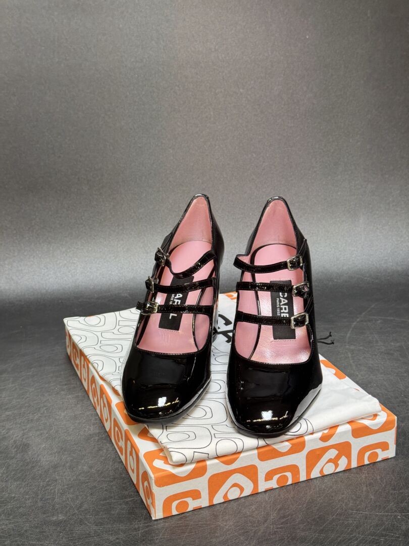 CAREL - Paire de souliers à talon, modèle "Keel", cuir agneau noir vernis, trois brides. Pointure 37,5 - Haut du talon : 8,5 cm Etat neuf