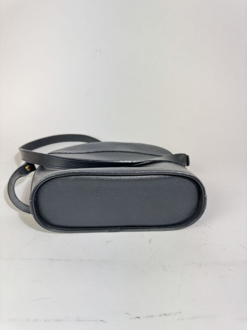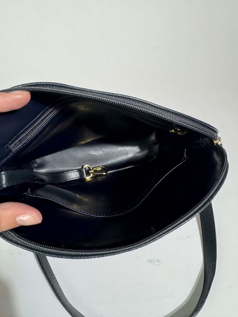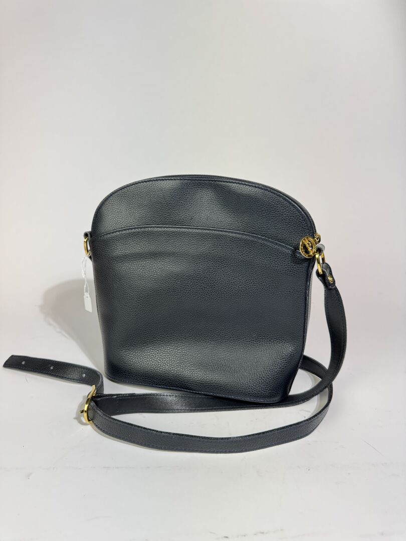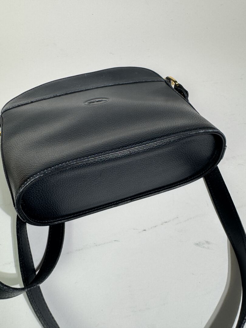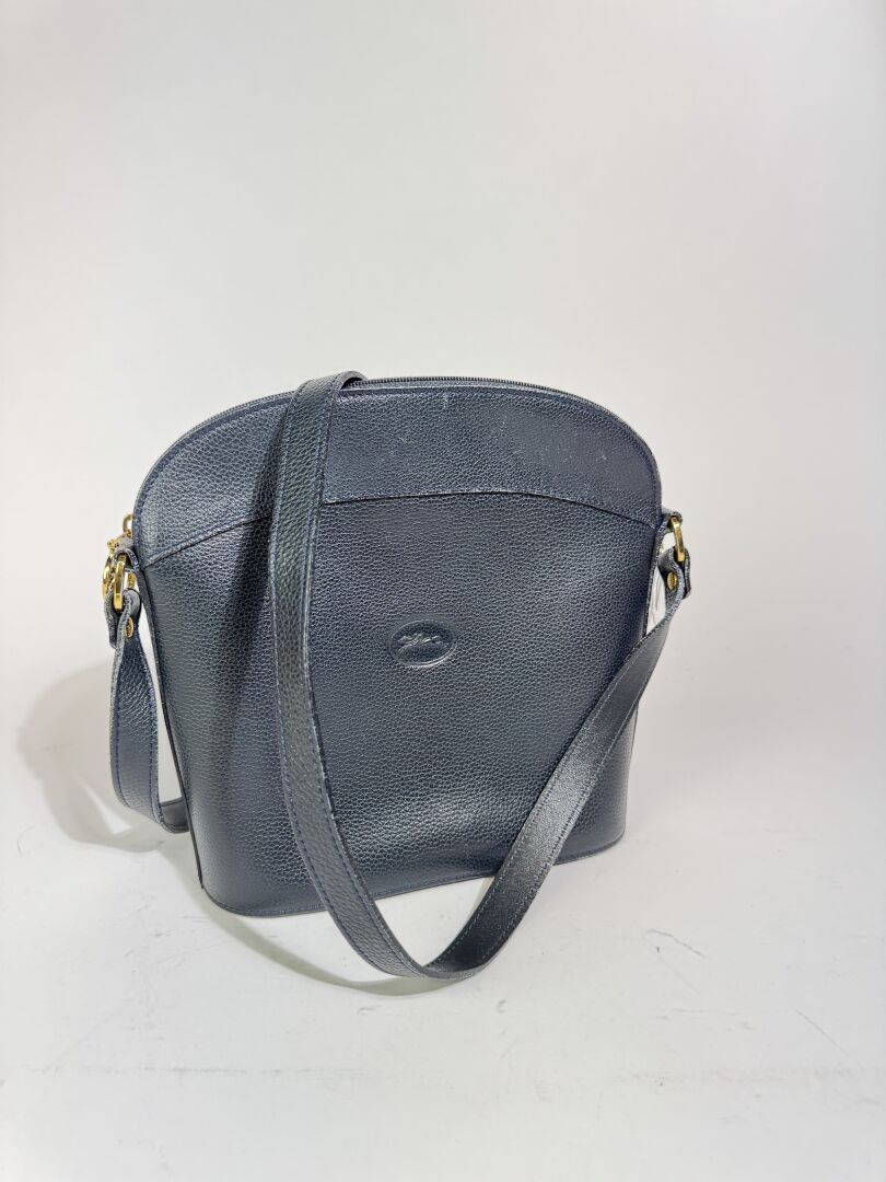 LONGCHAMP - Sac à main en cuir grainé marine, accastillage métal doré, anse bandoulière ajustable à la couleur, fermeture à glissière, une poche zippée et une poche plaquée à l'intérieur. Haut. : 24 cm - Long. : 22 cm Déjà porté, bon état général