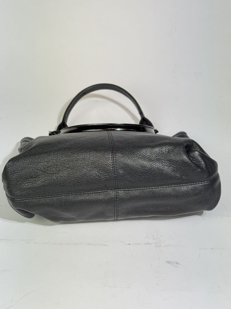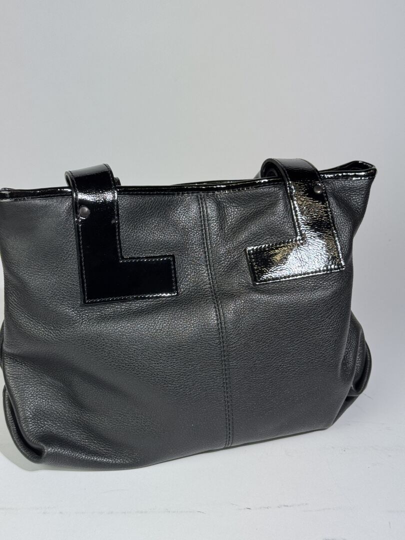LAMARTHE - Sac à main en cuir vieilli et cuir vernis noir, deux poignées, fermeture aimantée. Haut. : 21 cm - Long. : 28 cm Déjà porté, bon état général