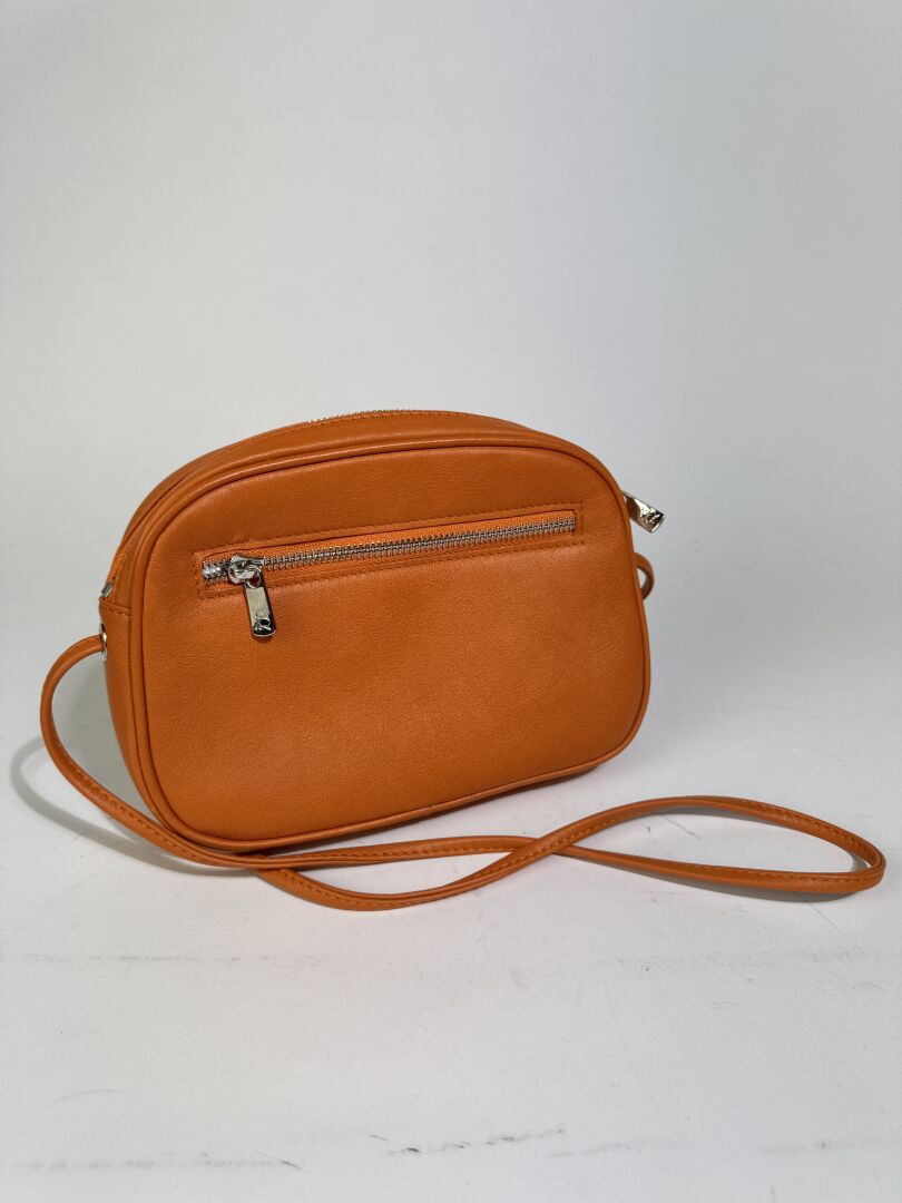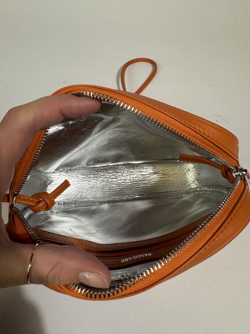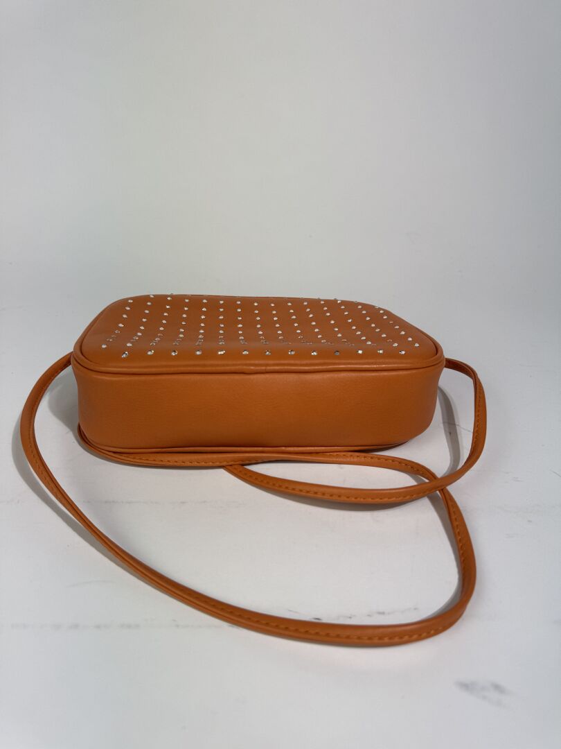 RENOUARD - Petit sac à main, cuir orange rehaussé de strass, anse bandoulière, poche extérieure zippée. Haut. : 15 cm - Long. : 20.5 cm Bon état général