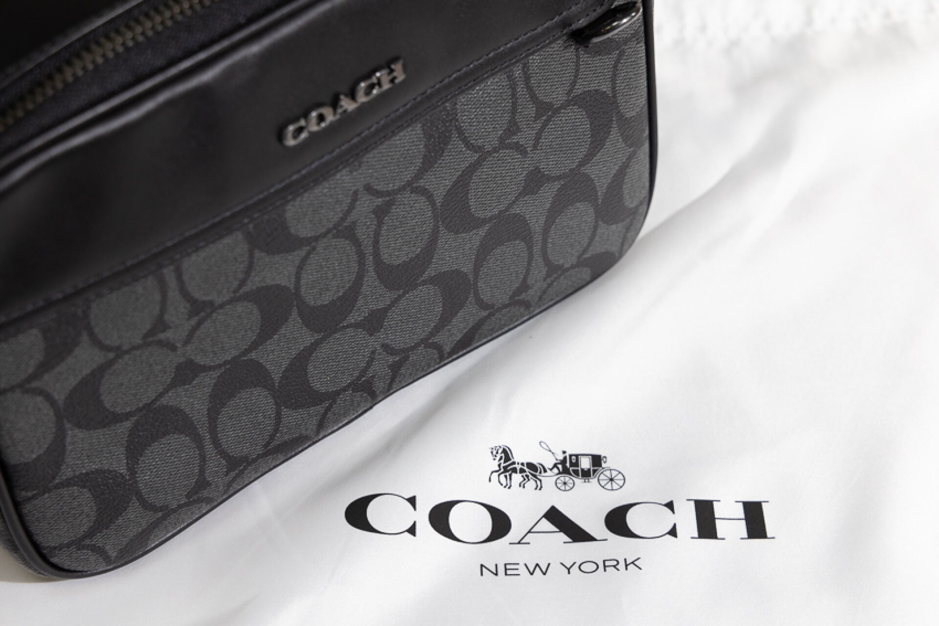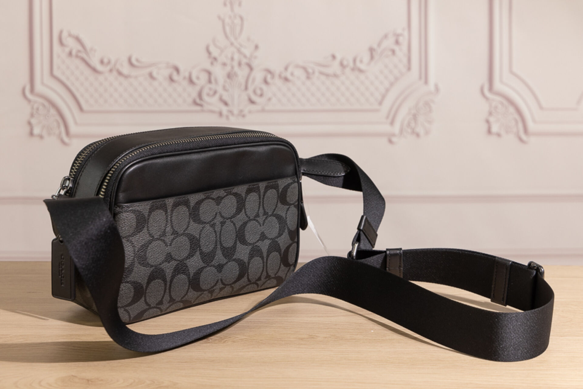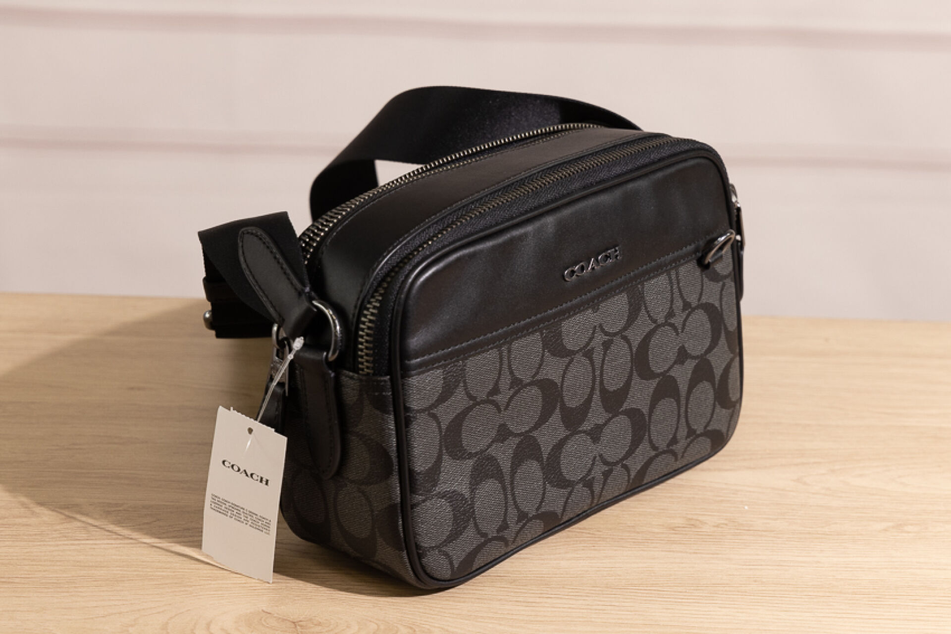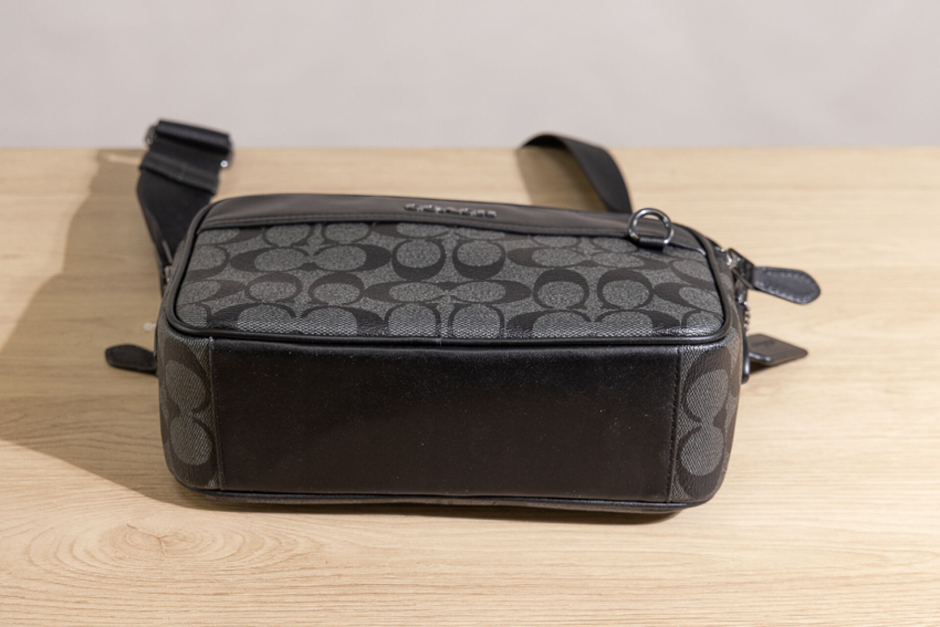 COACH. Sac en toile enduite siglée graphite et cuir noir, deux compartiments principaux zippés, anse bandoulière sangle réglable. H16xL24cm. Non porté, dust bag. (Ce lot chez vous en France métropolitaine pour 26.50 €)