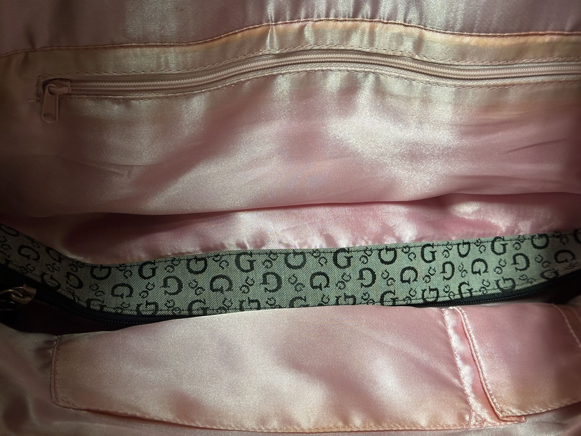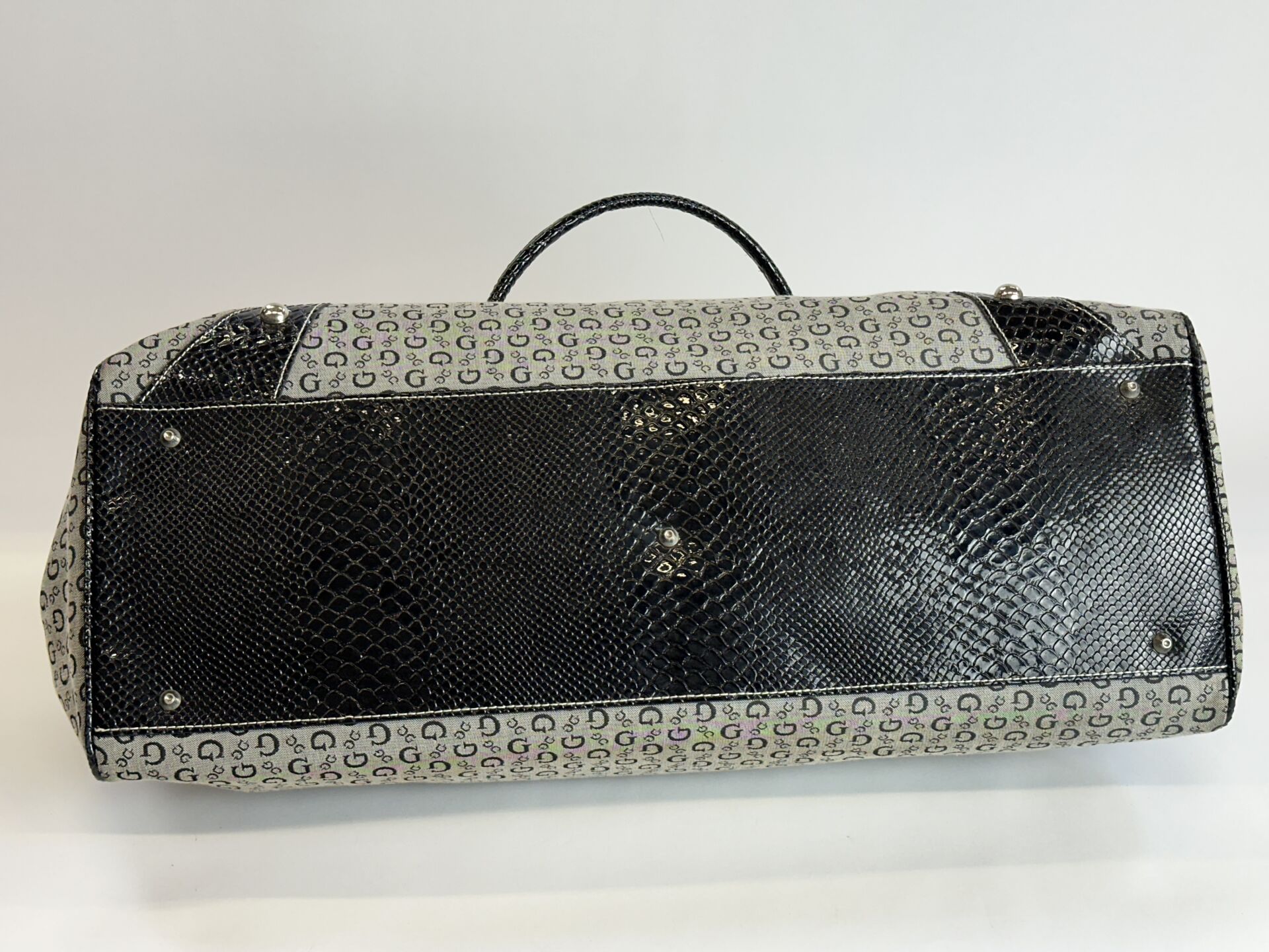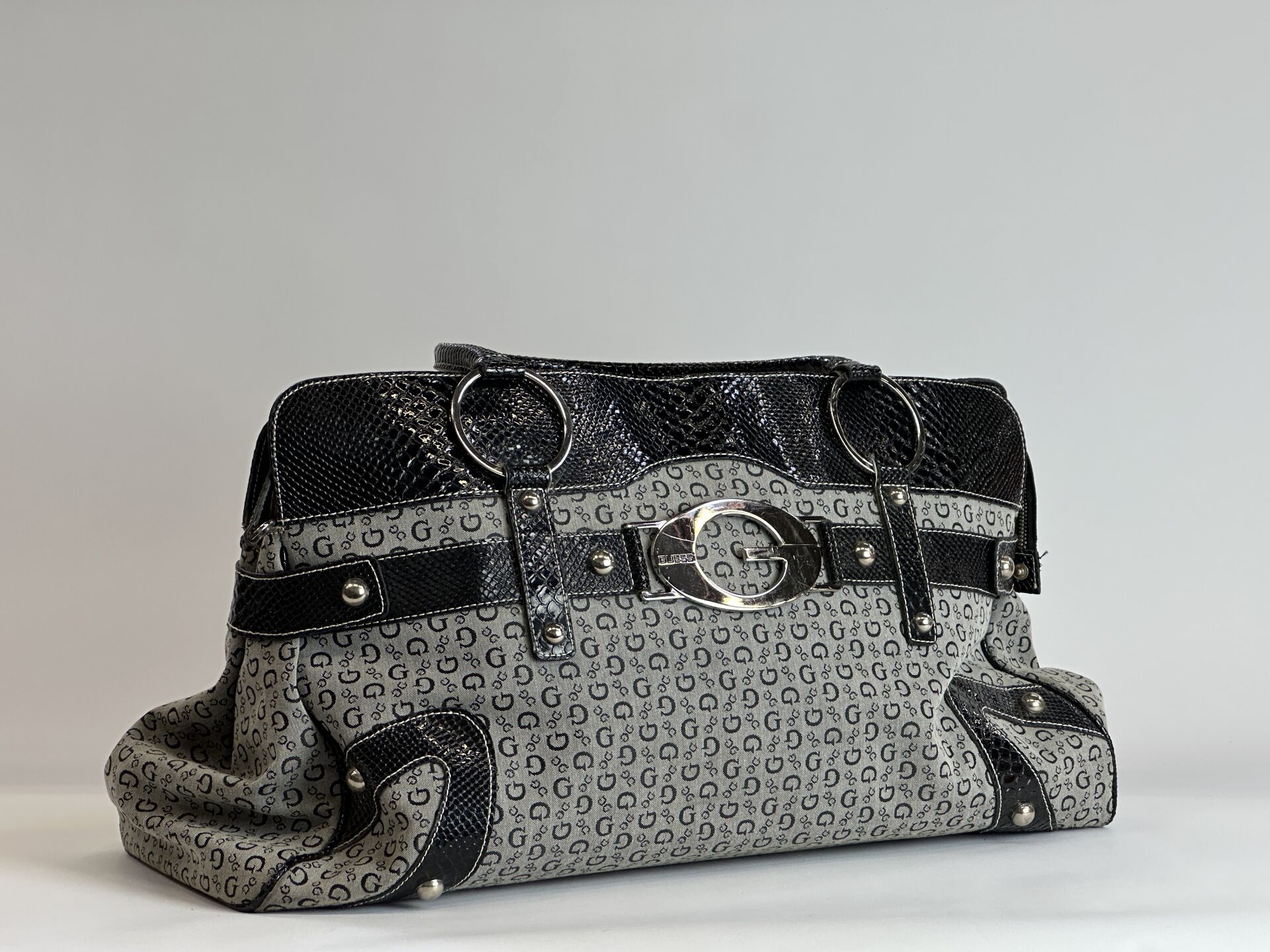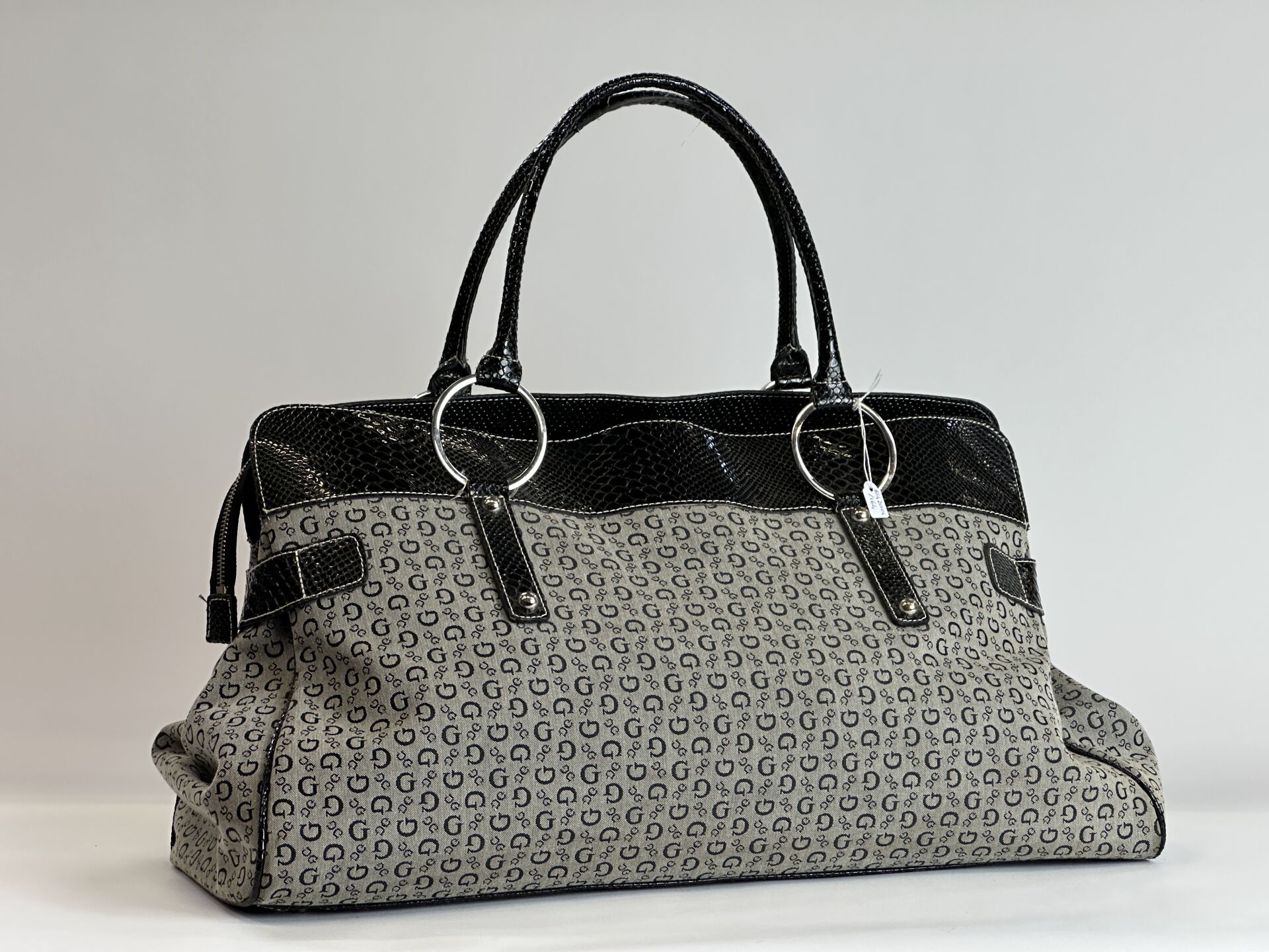 GUESS Grand sac cabas en toile monogramme gris et noir, empiècements cuir synthétique façon croco, anneaux et empiècements en métal doré. Long. : 55,5 cm (Ce lot chez vous en France métropolitaine pour 23,45 €)