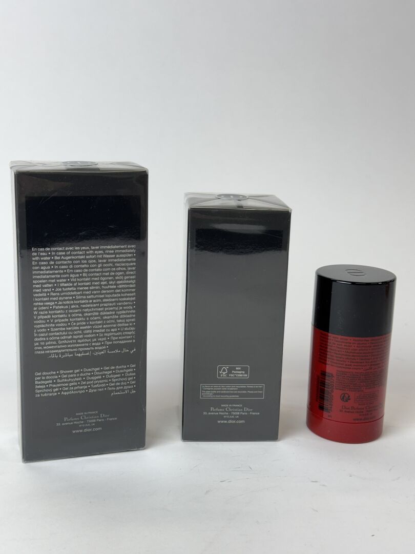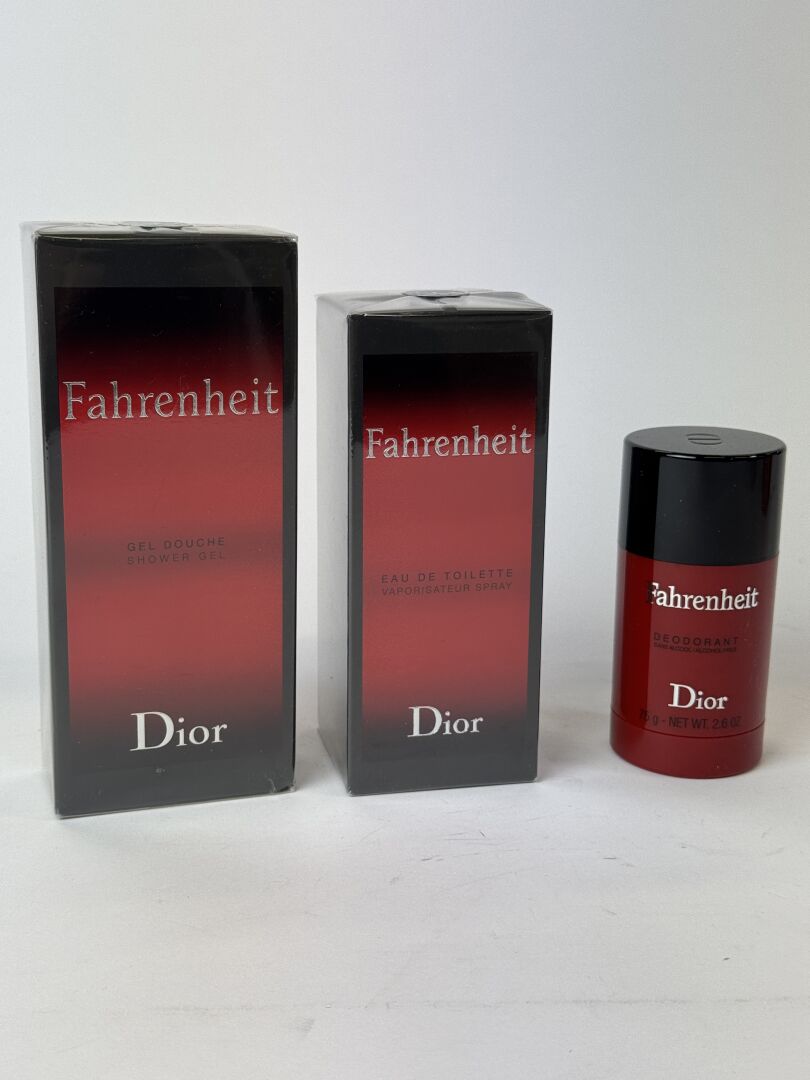 DIOR - Lot "Fahrenheit" comprenant une eau de toilette 100 ml, un gel douche 200 ml et un déodorant stock 75 gr.