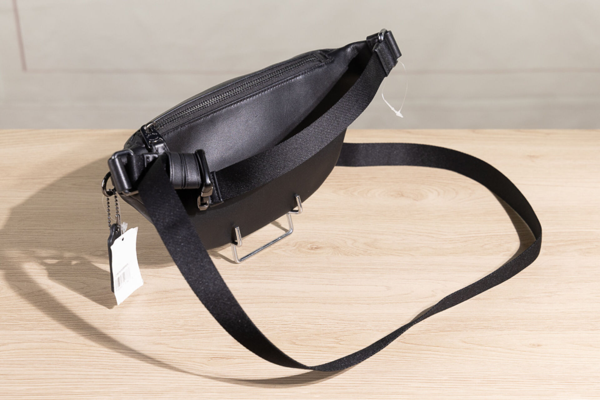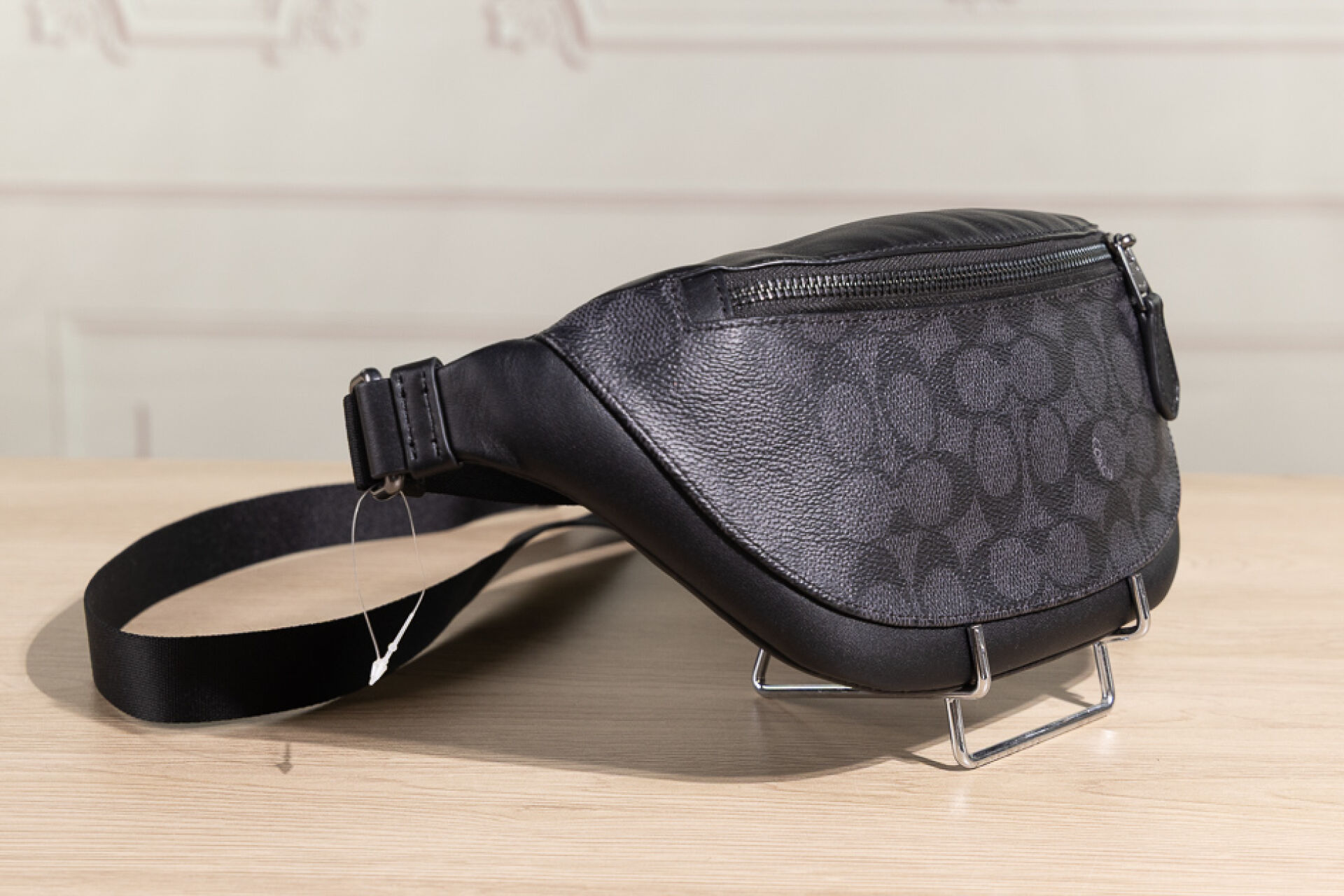 COACH - Banane en toile enduite graphite et cuir noir, deux poches zippée, ceinture pouvant faire bandoulière, sangle réglable. Haut. : 13 cm - Long. : 26 cm Non portée - Dustbag