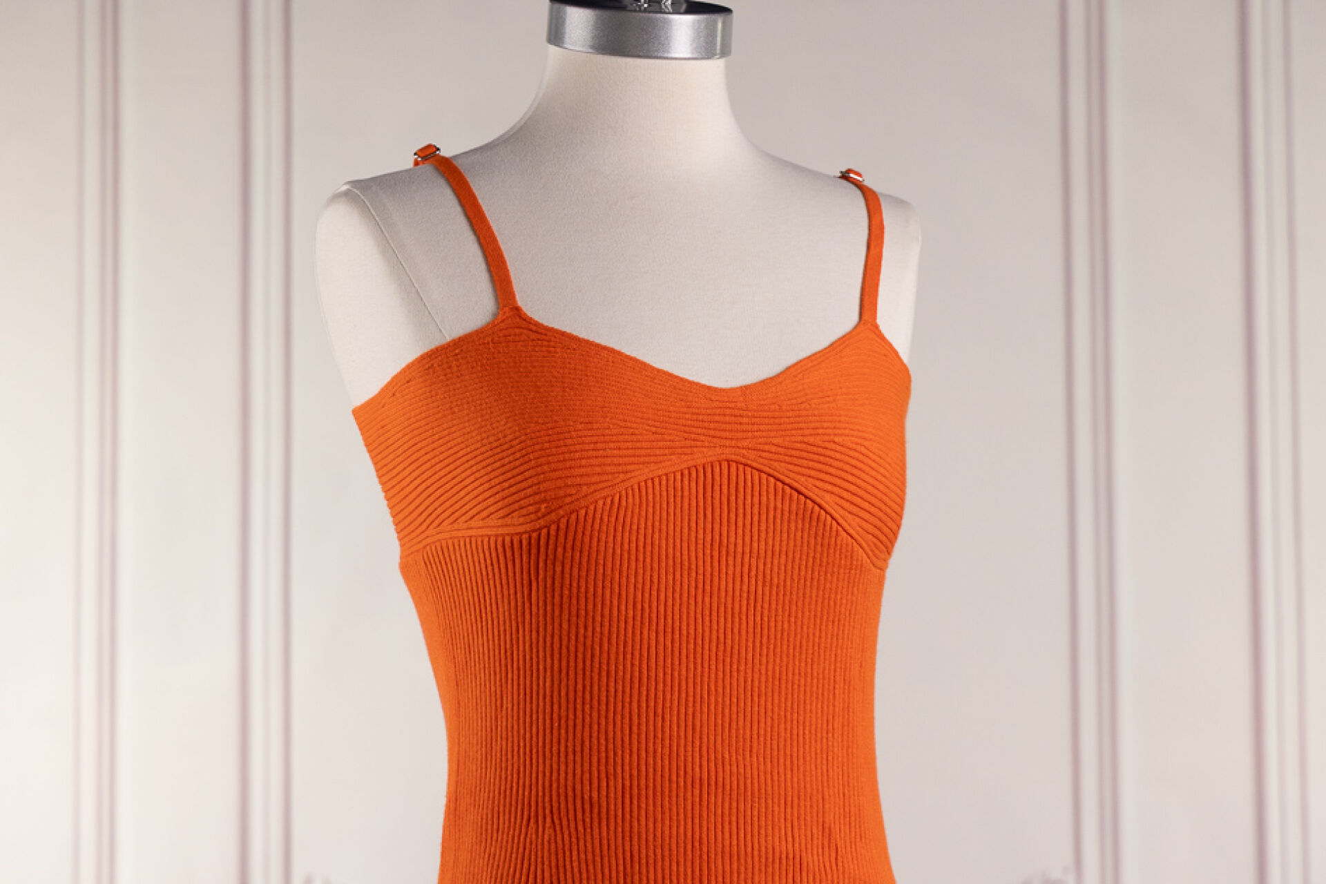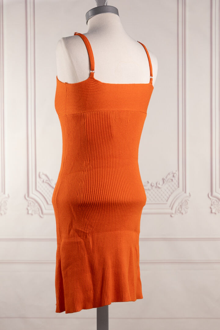 ERIC BOMPARD. Mini robe en cachemire cotelé orange à bretelles réglables. Taille indiquée M. Non portée.