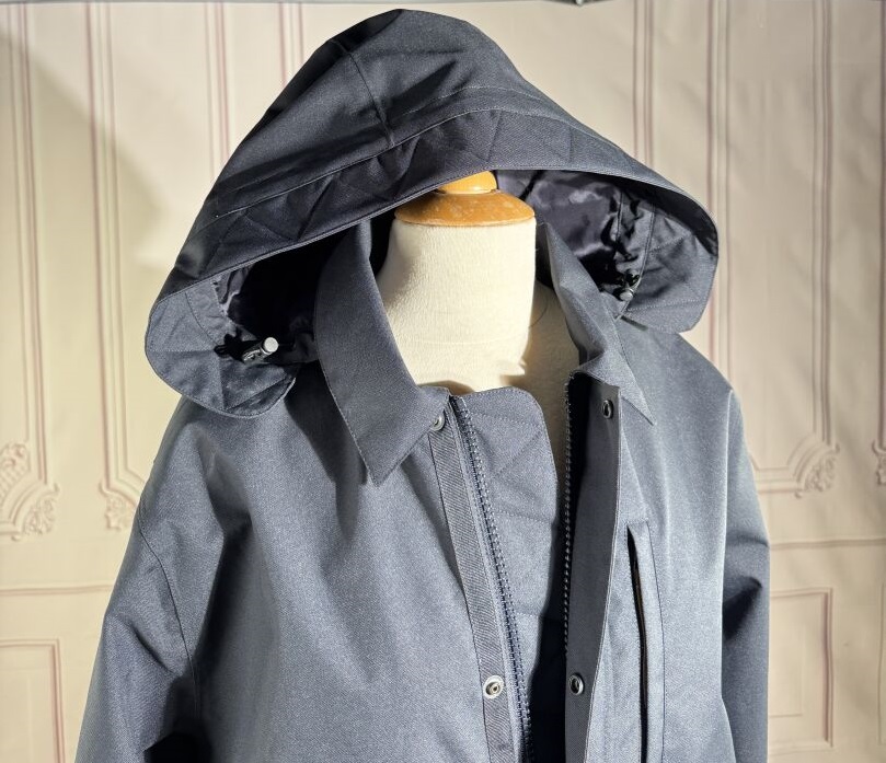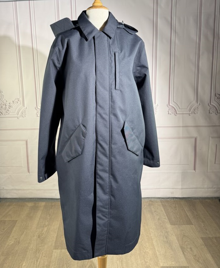 BONNE GUEULE - Manteau long homme, tissu imperméable marine, petit col, fermeture à glissière sous rabat à pression, deux poches en biais sous rabat, poche poitrine en biais zippée, capuche, manches longues. Taille M Etat magasin