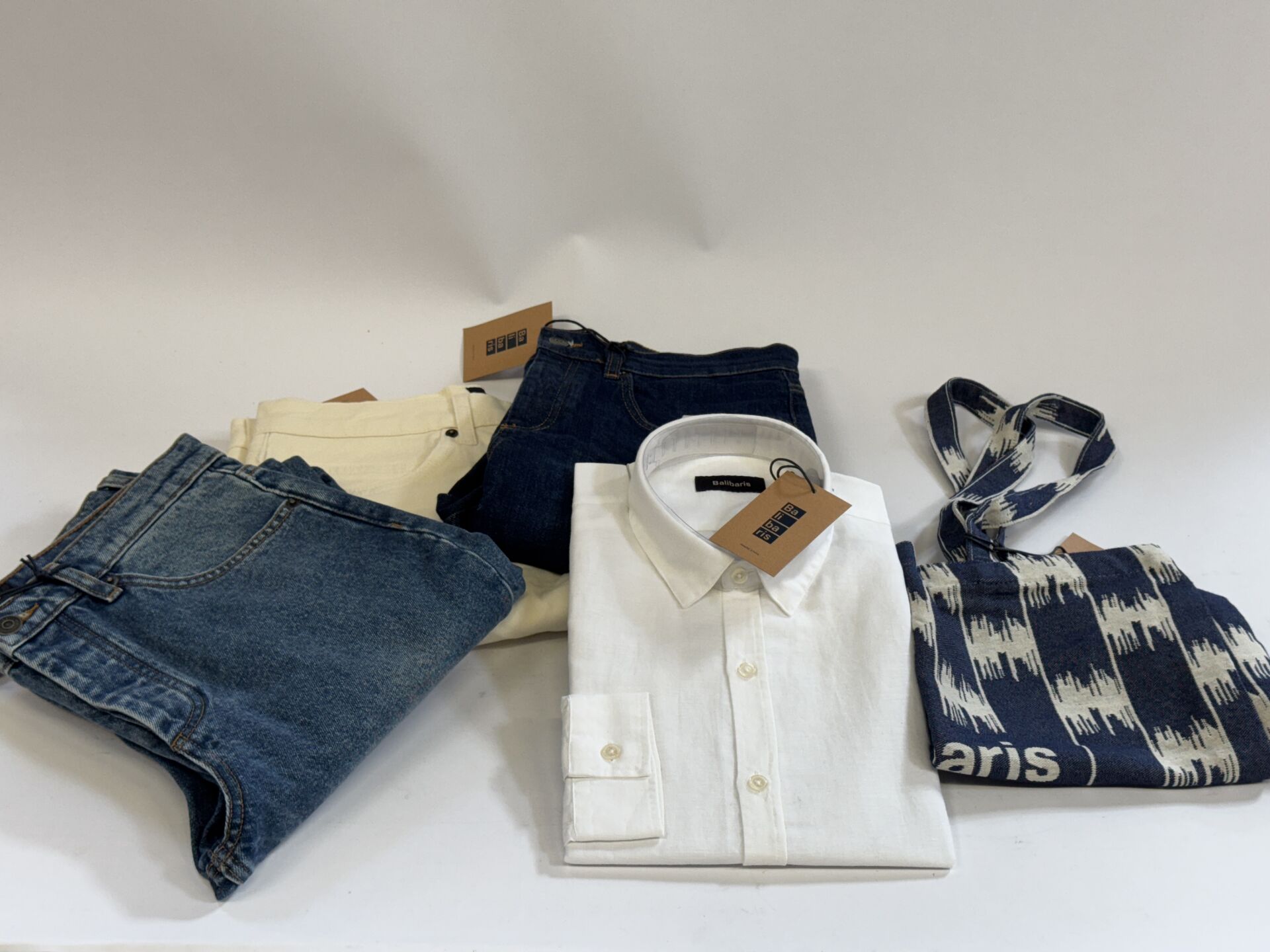BALIBARIS - Ensemble de quatre articles homme, comprenant une chemise en lin blanc et trois jean's, denim bleu et blanc (tailles 30 et 31). Etat magasin On joint un tote bag.