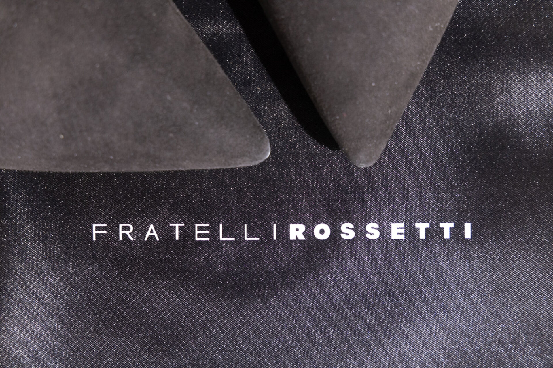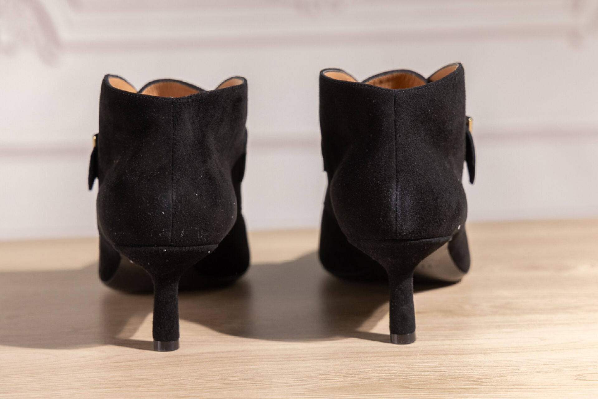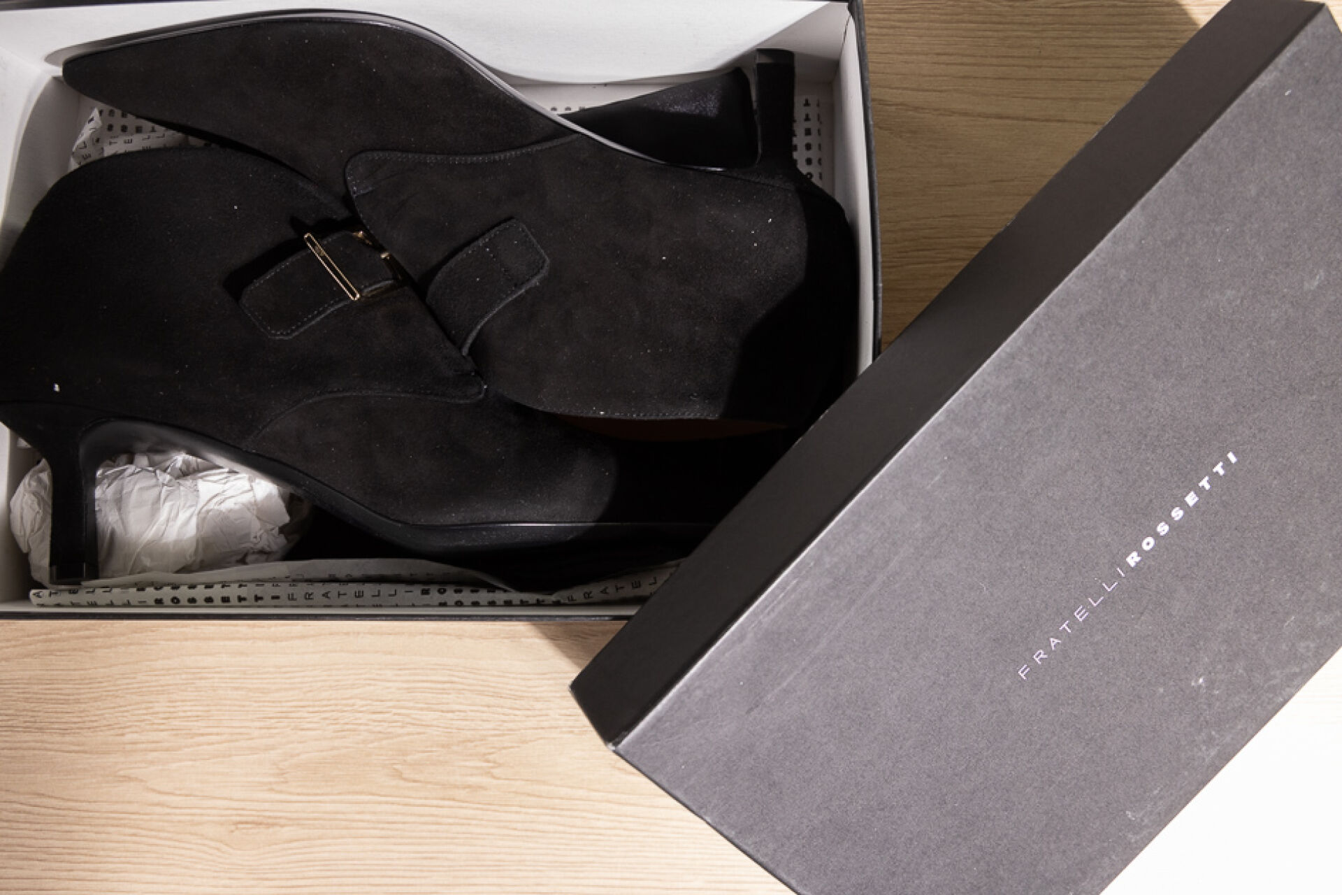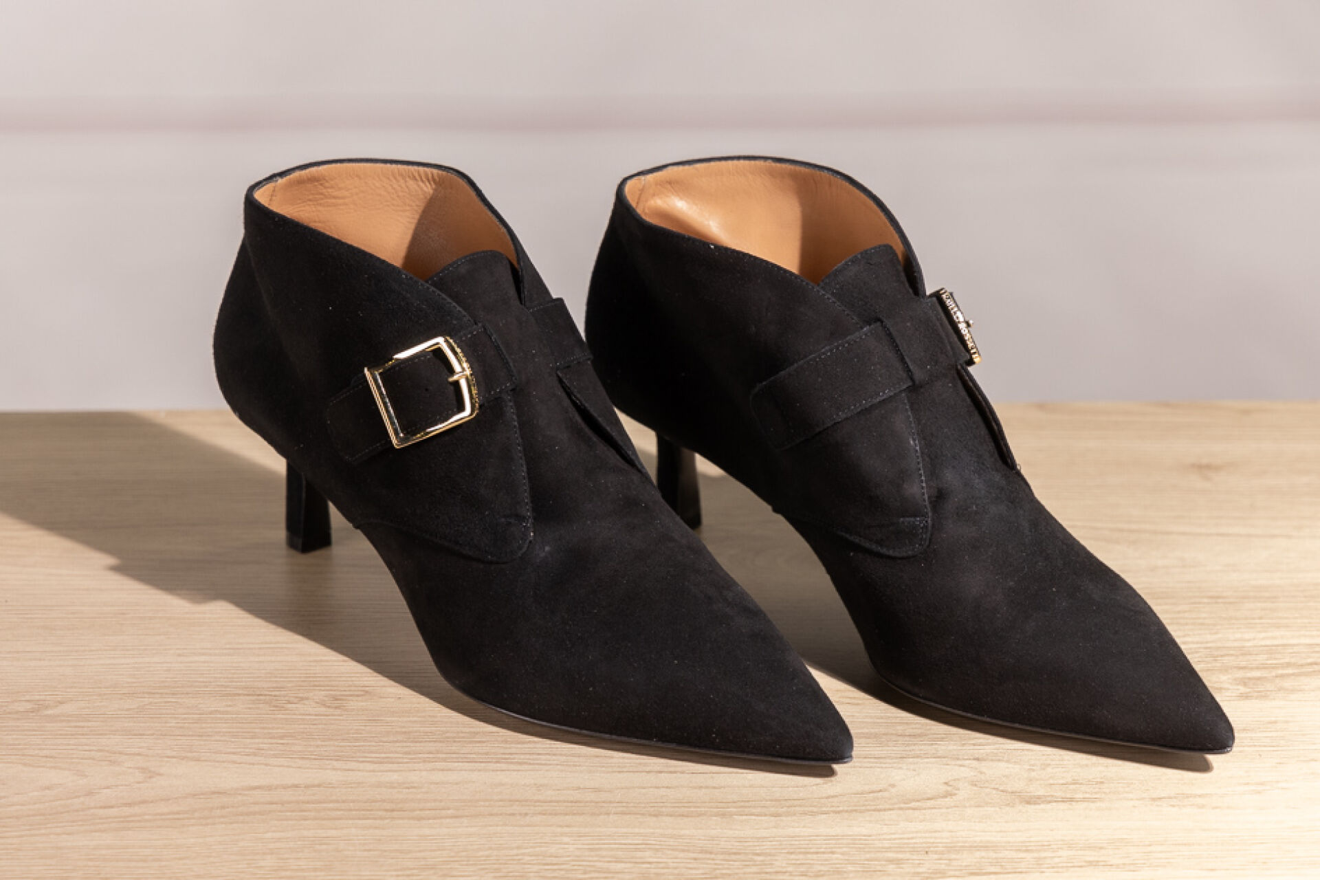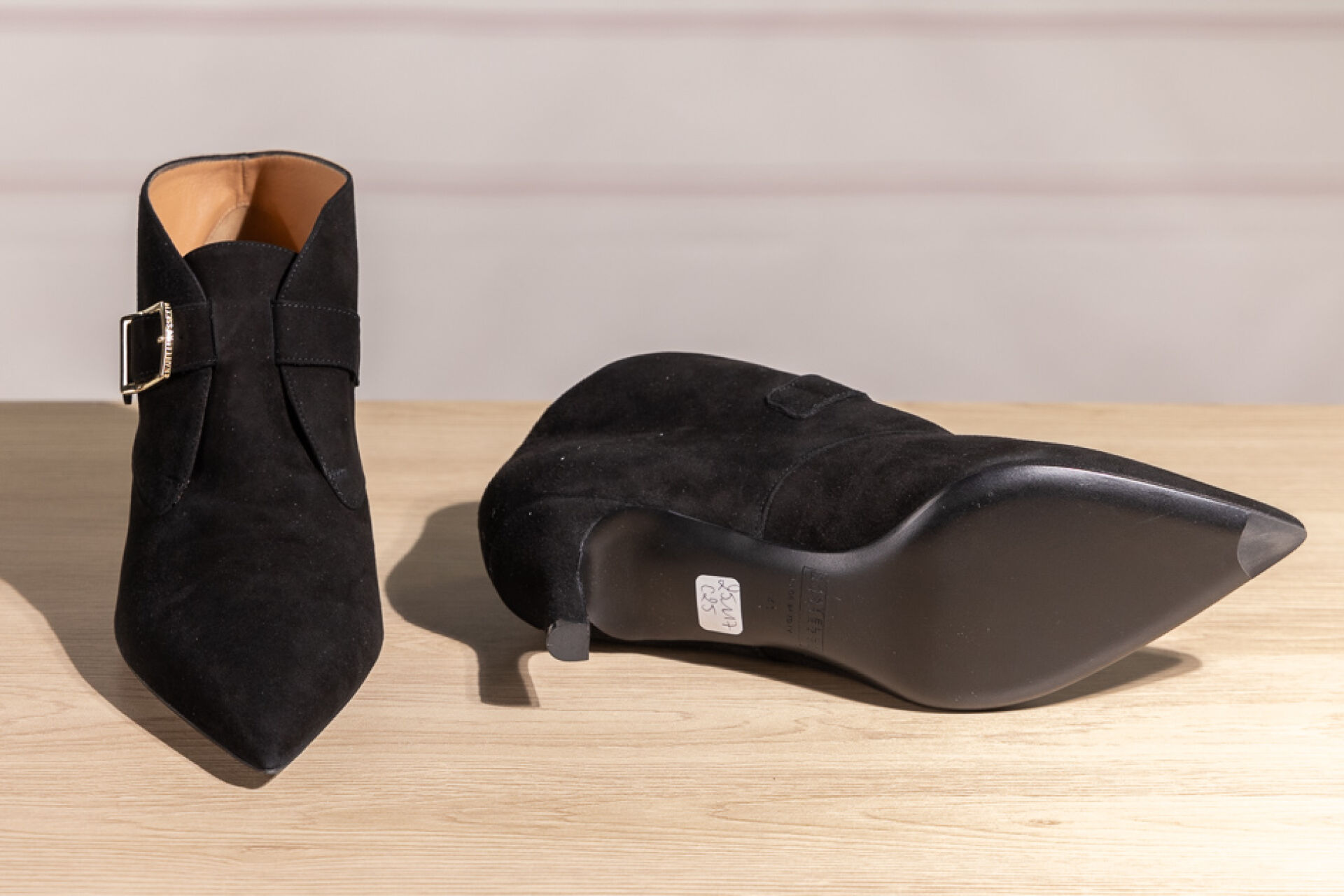 FRATELLI ROSSETTI. Paire de bottines en daim noir, bout pointu, empeigne à boucle, talon de 6cm. Pointure 41. Non portées, boite.