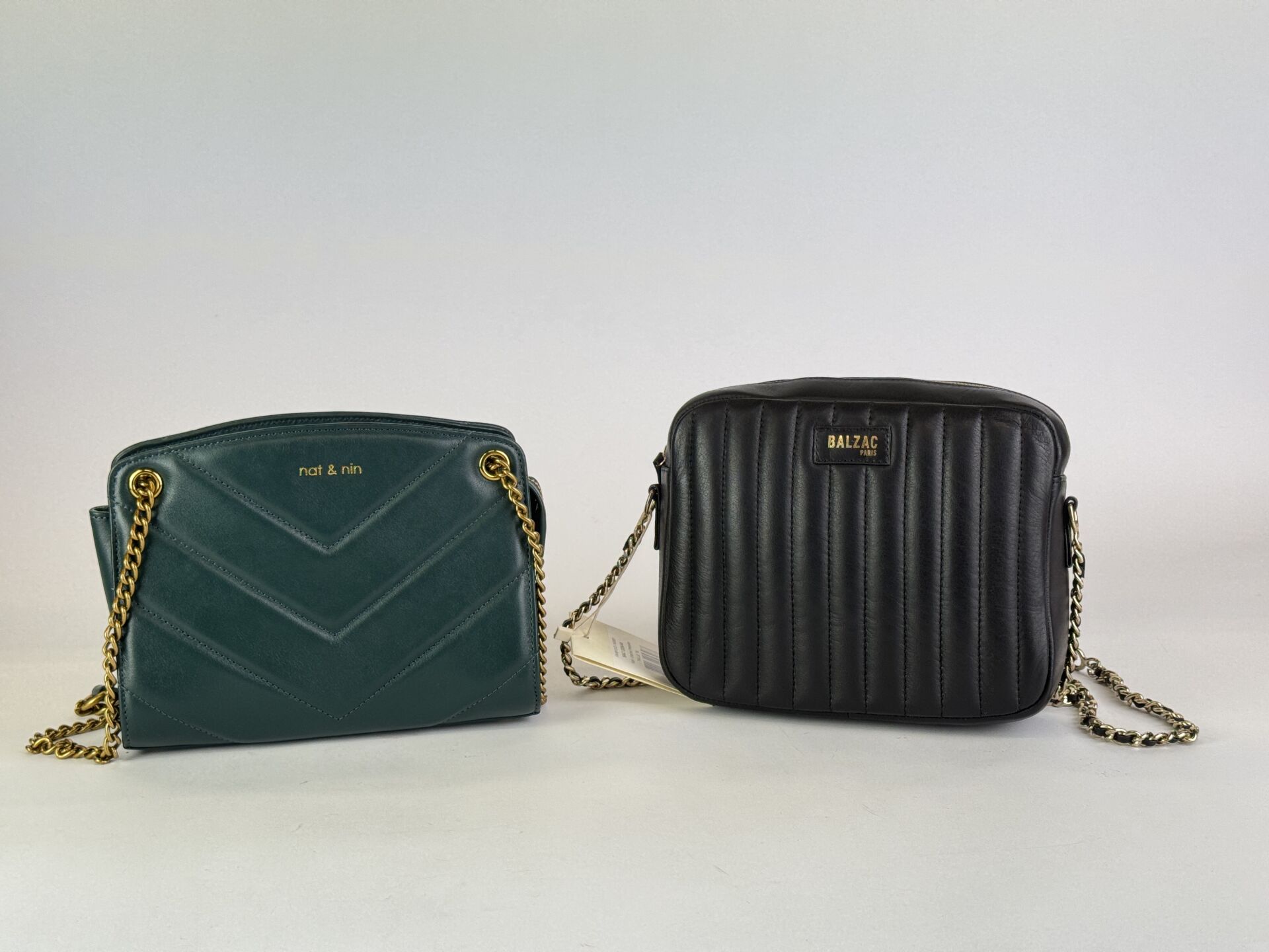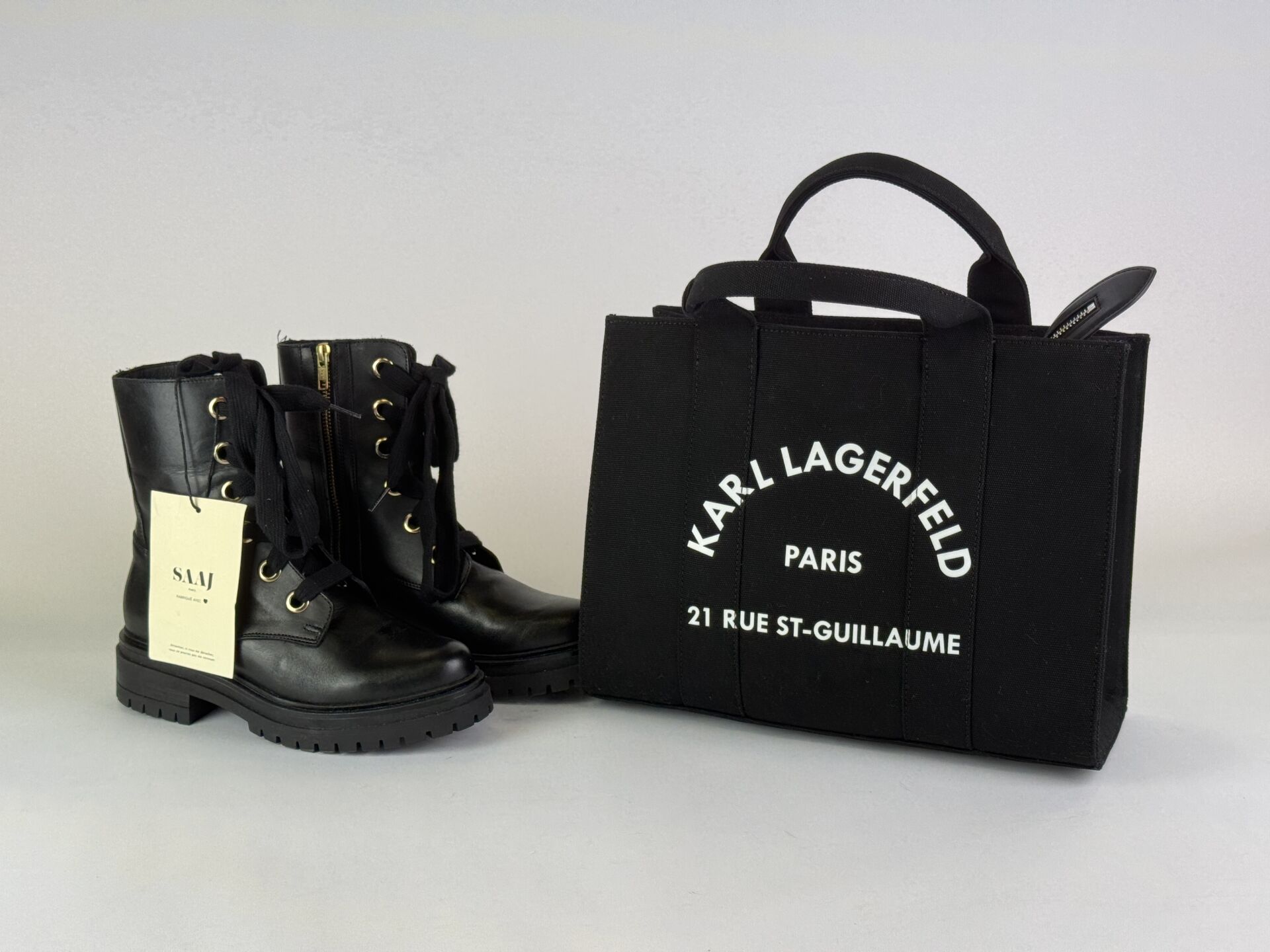BALZAC - NAT & NIN - KARL LAGERFELD - SAAJ Lot comprenant un sac à main en cuir noir, anse bandoulière chaine métal doré, fermeture zip ; un sac à main cuir vert sapin, double anse métal doré, fermeture zip ; un sac cabas en toile noire, double anse, anse bandoulière, fermeture zip et une paire de chaussures montantes à lacets modèle "Stanley", pointure 37. Etat magasin
