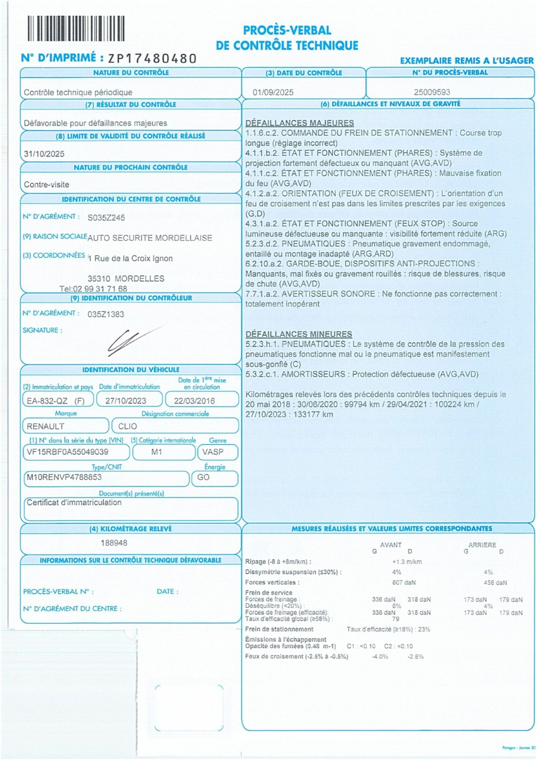 BOITE MANUELLE CLIMATISATION AUTORADIO INTERIEUR SALE FROTTEMENTS, USURES D'USAGE, ADHESIFS PUBLICITAIRES INTERIEUR TISSU MAUVAIS ETAT DEFAILLANCES MAJEURES : COMMANDE DE FREIN DE STATIONNEMENT COURSE TROP LONGUE, REGLAGE INCORRECT PHARES, SYSTEME DE PROJECTION FORTEMENT DEFECTUEUX OU MANQUANT AVG AVD MAUVAISE ORIENTATION DES FEUX DE CROISEMENT G D FEUX STOP : SOURCE LUMINEUSE DEFECTUEUSE LUMINOSITE FORTEMENT REDUITE ARG PNEUS GRAVEMENT ENDOMMAGE, ENTAILLE OU MONTAGE INADAPTE ARG ARD GARDE BOUE MANQUANT, MAL FIXE OU FORTEMENT ROUILLE AVG AVD AVERTISSEUR SONORE INOPERANT DEFAILLANCES MINEURES : SYSTEME DE CONTROLE DE LA PRESSION DES PNEUS FONCTIONNE MAL AMORTISSEURS : PROTECTION DEFECTUEUSE AVG AVD