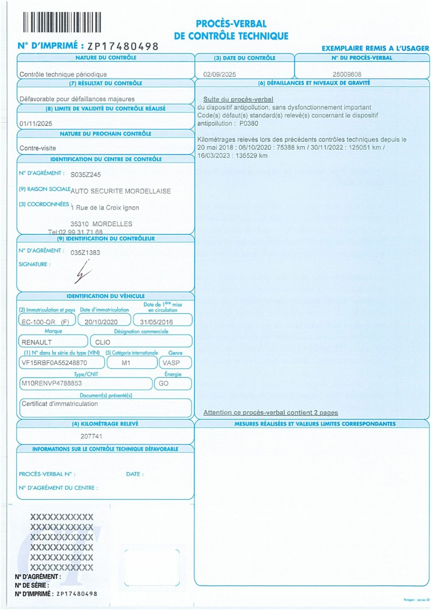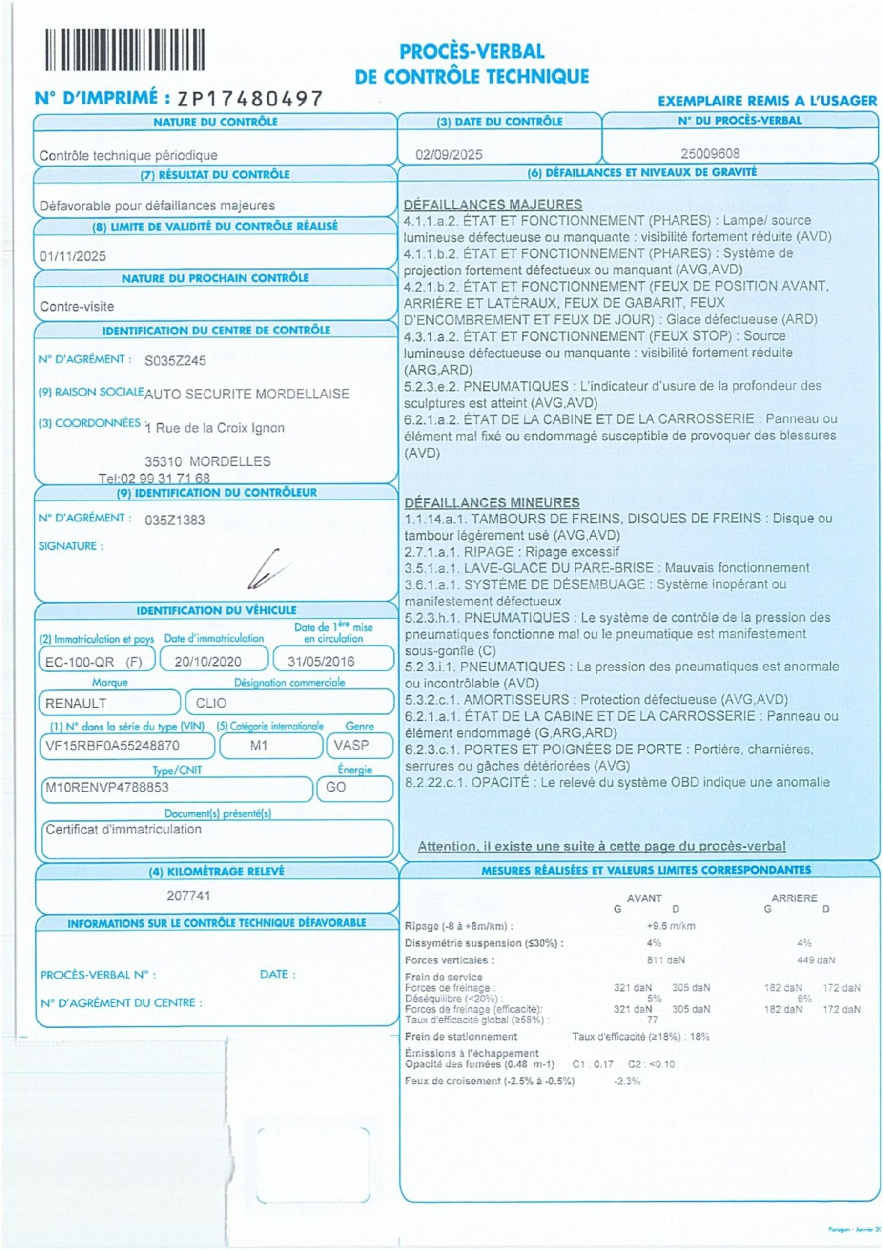 BOITE MANUELLE AUTORADIO, CLIMATISATION CHOCS, FROTTEMENTS, ENFONCEMENTS INTERIEUR TISSU FEU ARRIERE DROIT ACCIDENTE, AILE AVANT GAUCHE CASSEE DEFAILLANCES MAJEURES : PHARE : LAMPE/SOURCE LUMINEUSE DEFECTUEUSE AVD, SYSTEME DE PROJECTION DEFECTUEUX OU MANQUANT AVG AVD AUTRES FEUX GLACE DEFECTUEUSES ARD FEUX STOP VISIBILITE FORTEMENT REDUITE ARG ARD PNEUS INDICATEUR D'USURE EST ATTEINT AVG AVD CABINE : PANNEAU OU ELEMENT MAL FIXE AVD DEFAILLANCES MINEURES : TAMBOURS DE FREINS LEGERMENT USES RIPAGE EXCESSIF LAVE GLACE PARE BRISE MAUVAIS FONCTIONNEMENT DESEMBUAGE INOPERANT SYSTEME DE CONTROLE DE LA PRESSION DES PNEUS INOPERANT OU PRESSION ANORMALE AMORTISSEURS : PROTECTION DEFECTUEUSE PORTIERE, CHARNIERES, SERRURES, GACHES DETERIOREES AVG ANOMALIE DU SYSTEME OBD
