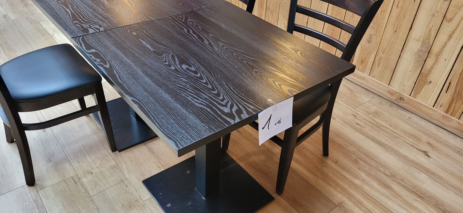 16 tables en mélaminé noir et piètement noir 2 couverts 70x70 cm