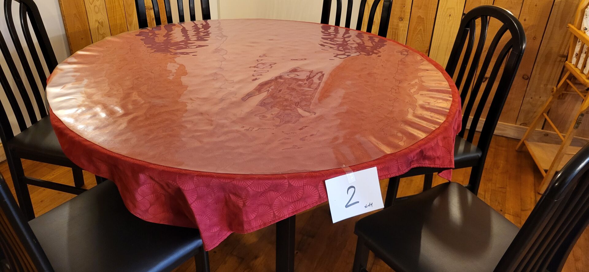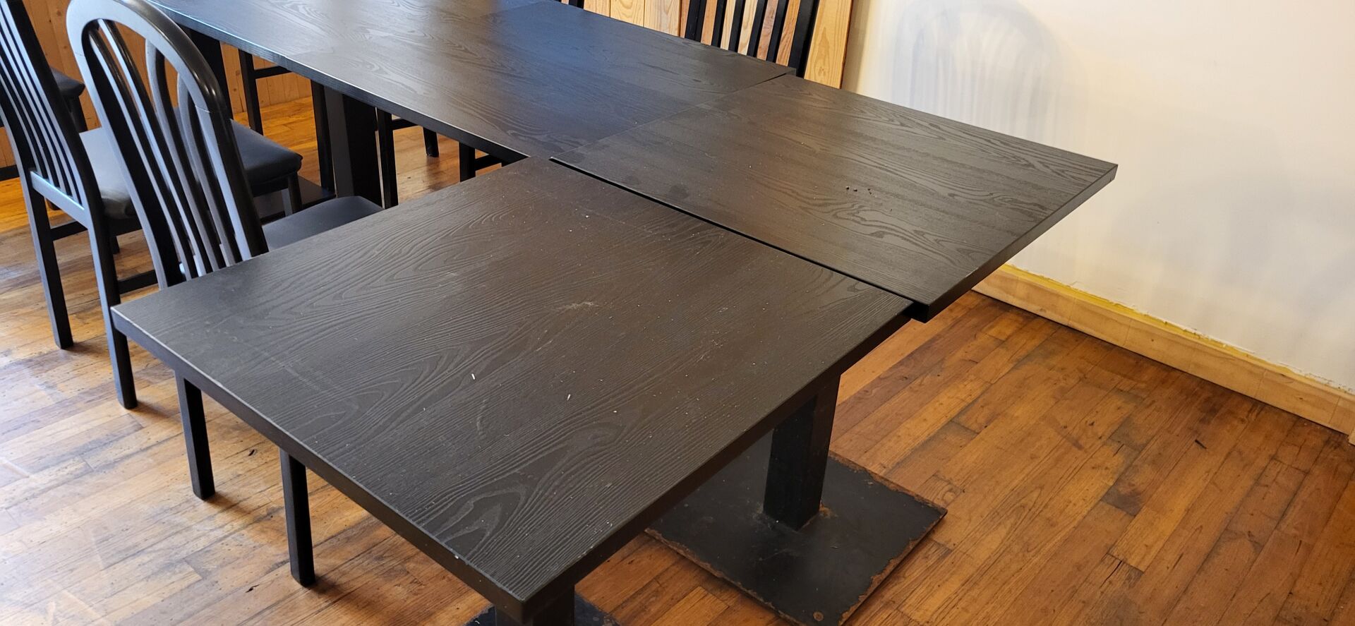 9 tables en mélaminé noir et piètement noir 2 couverts dont 7 en 70x70 cm et 2 en 65x65 cm 2 tables circulaires en mélaminé noir piètement bois noir diam. : 140 cm