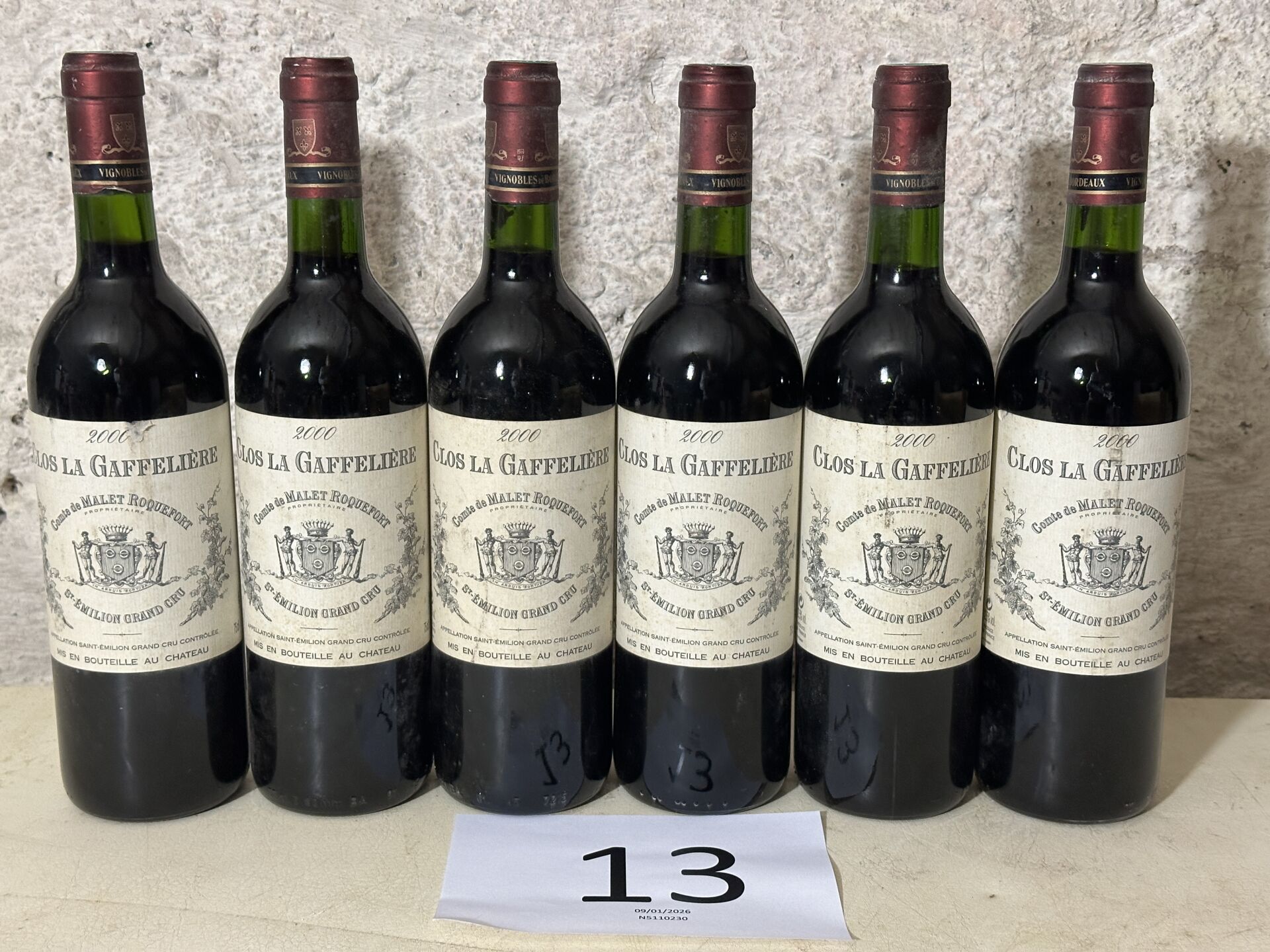 Vendu sur désignation le 14 01 2026 à 12H , 24 rue du marché commun 44300 NANTES , sur photographies. Enlèvement à NANTES (Centre) sur RDV avec la STEM. 6 bouteilles de Saint Emilion Grand Cru CLOS LA GAFFELIERE Comte de Malet Roquefort 2000