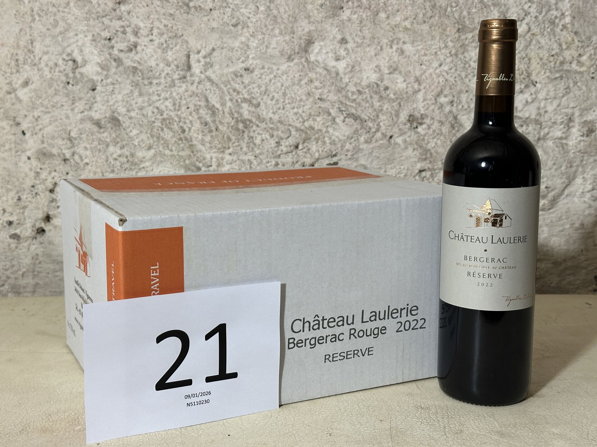 Vendu sur désignation le 14 01 2026 à 12H , 24 rue du marché commun 44300 NANTES , sur photographies. Enlèvement à NANTES (Centre) sur RDV avec la STEM. 84 bouteilles de Bergerac rouge CHÂTEAU LAULERIE Réserve 2022 (14 cartons)