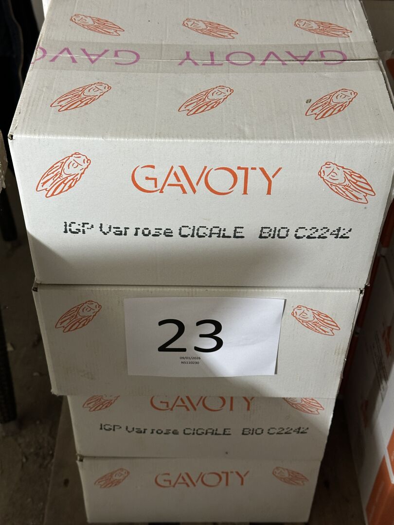 Vendu sur désignation le 14 01 2026 à 12H , 24 rue du marché commun 44300 NANTES , sur photographies. Enlèvement à NANTES (Centre) sur RDV avec la STEM. 84 bouteilles de rosé Pays du Var LA CIGALE Roselyne Gavoty Bio (14 cartons)