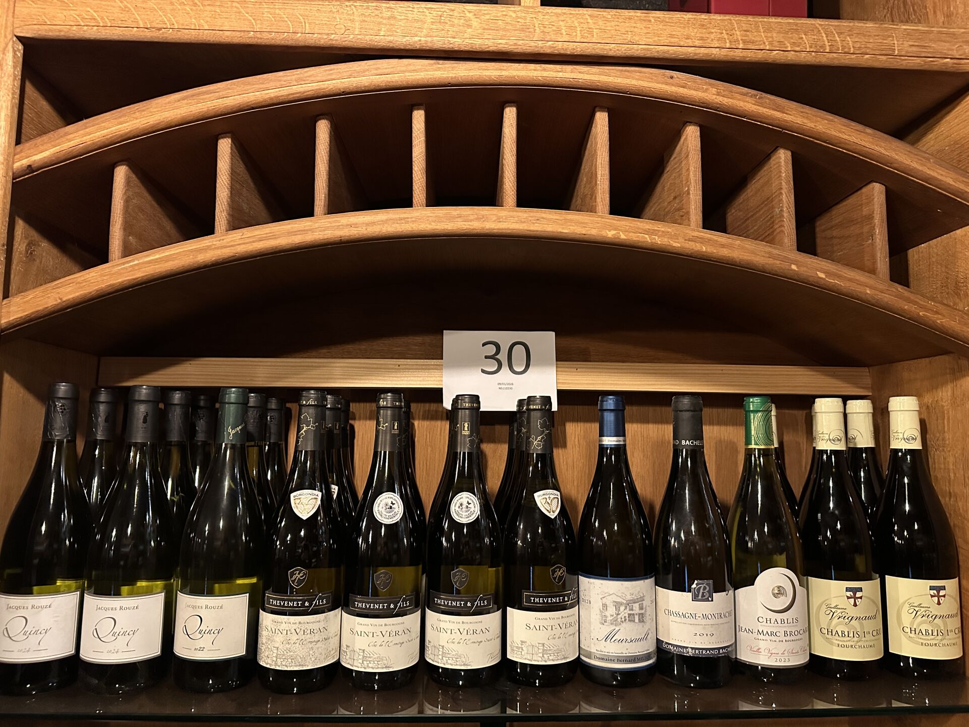 Vendu sur désignation le 14 01 2026 à 12H , 24 rue du marché commun 44300 NANTES , sur photographies. Enlèvement à NANTES (Cité des Congrès) sur RDV avec la STEM. Sur 1 étagère, 28 bouteilles de Bourgogne blanc : 9 Quincy ROUZE 2024 et 2022, 11 St Véran THEVENET 2023 et 2024, 1 Meursault MILLOT 2020, 1 Chassagne-Montrachet BACHELET 2019, 5 Chablis 1er cru VRIGNAUD 2021 et 1 BROCARD 2023.