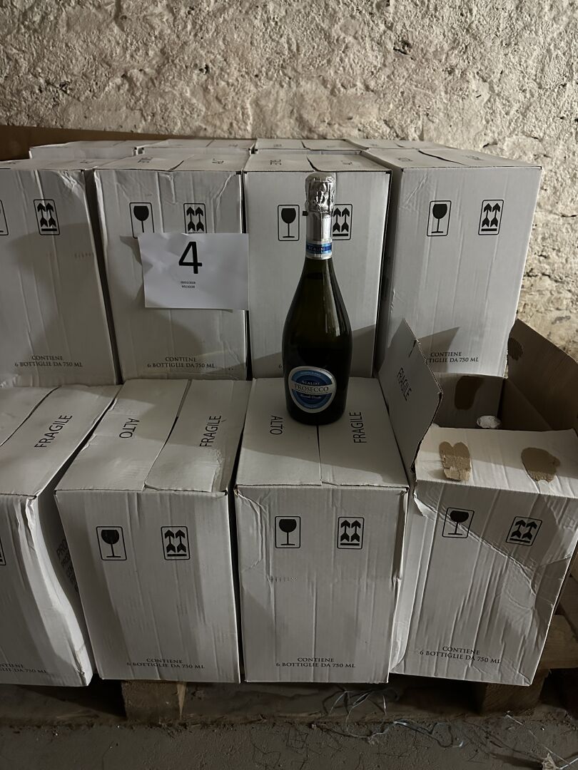 Vendu sur désignation le 14 01 2026 à 12H , 24 rue du marché commun 44300 NANTES , sur photographies. Enlèvement à NANTES (Centre) sur RDV avec la STEM. 118 bouteilles de Prosecco SCALINI Grande Cuvée Extra Dry