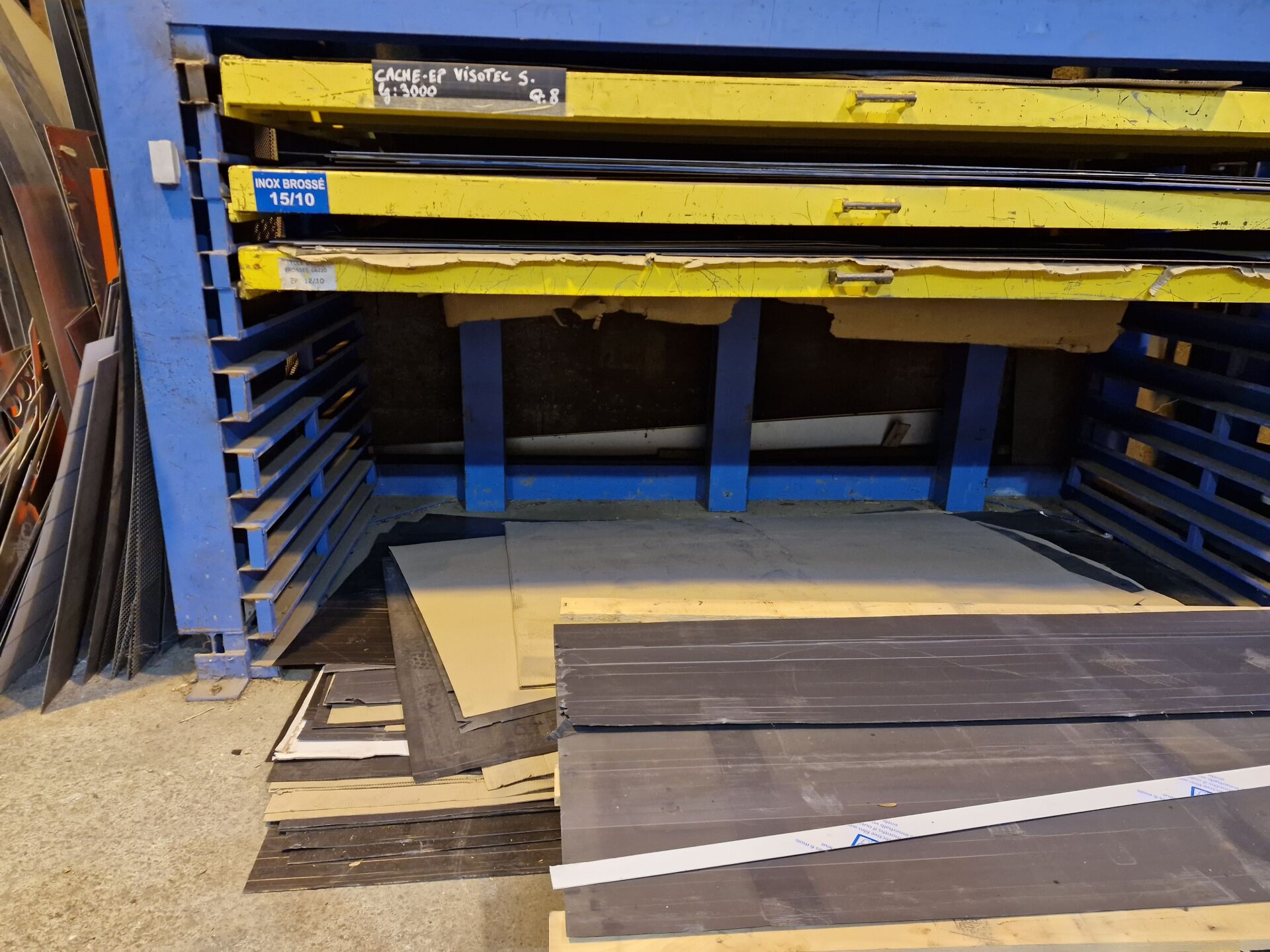 2 racks à tôle, l'un à 3 tiroirs 320 X 170 cm, 1 rack CANTILEVER 8 niveaux hauteur 5 m - Sans le contenu Note : nécessite le démontage et découpage pour le sortir