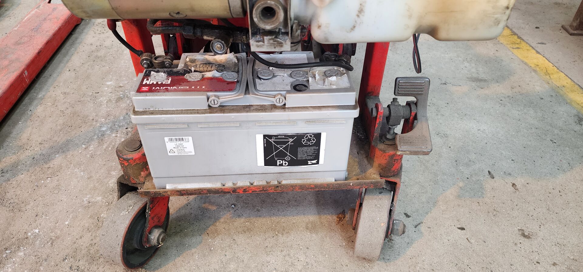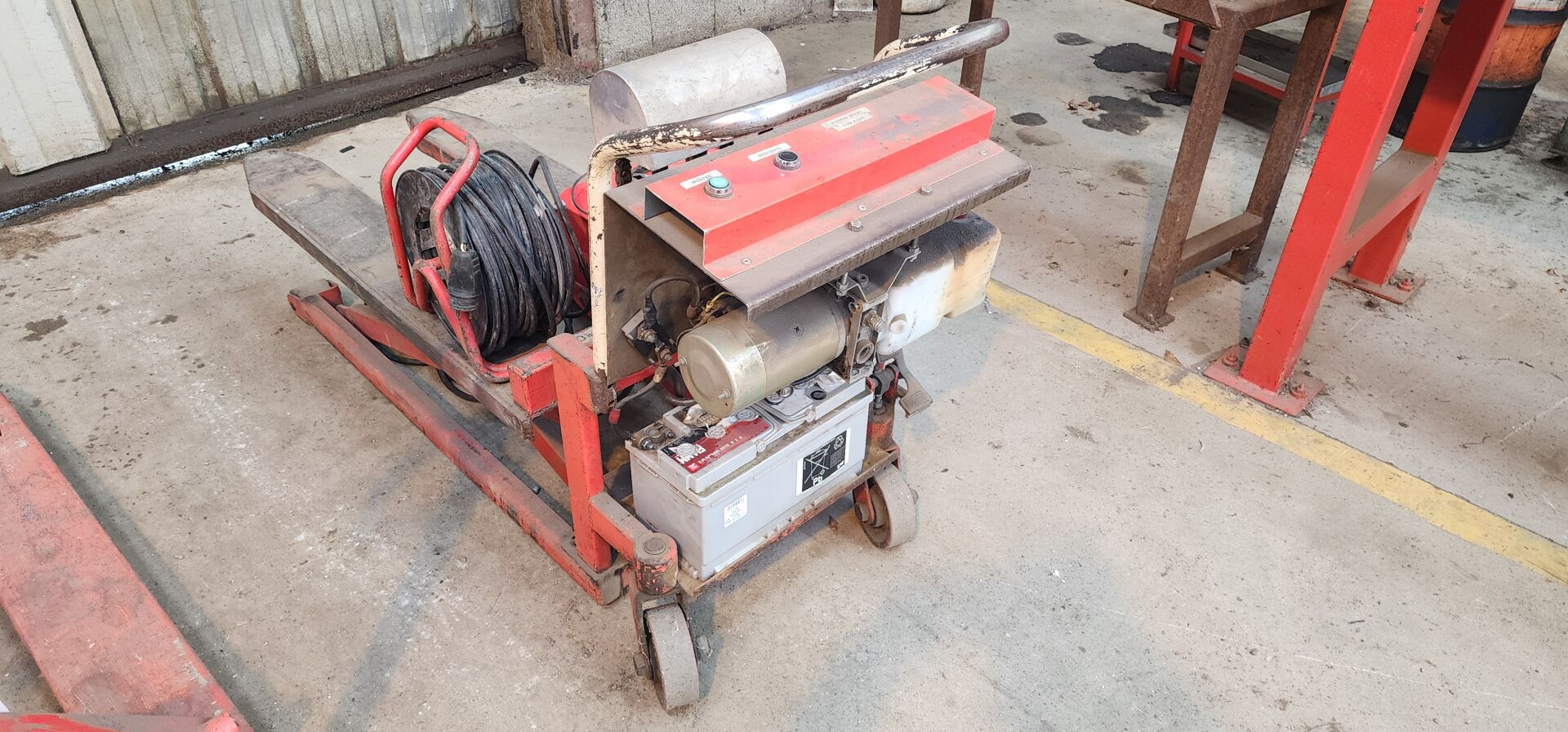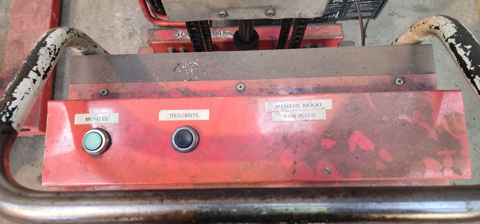 1 gerbeur électrique sans marque apparente, ancien modèle 500 kg 1 chargeur de batterie LACME VAC 300 1 rallonge électrique sur touret