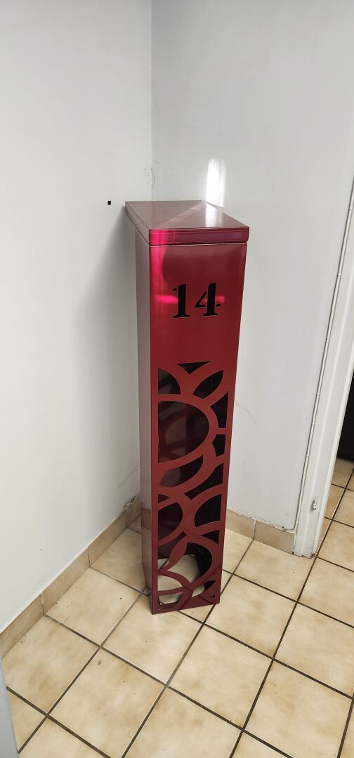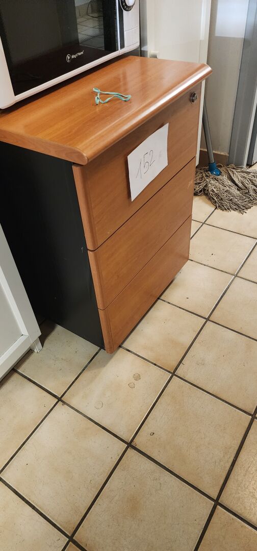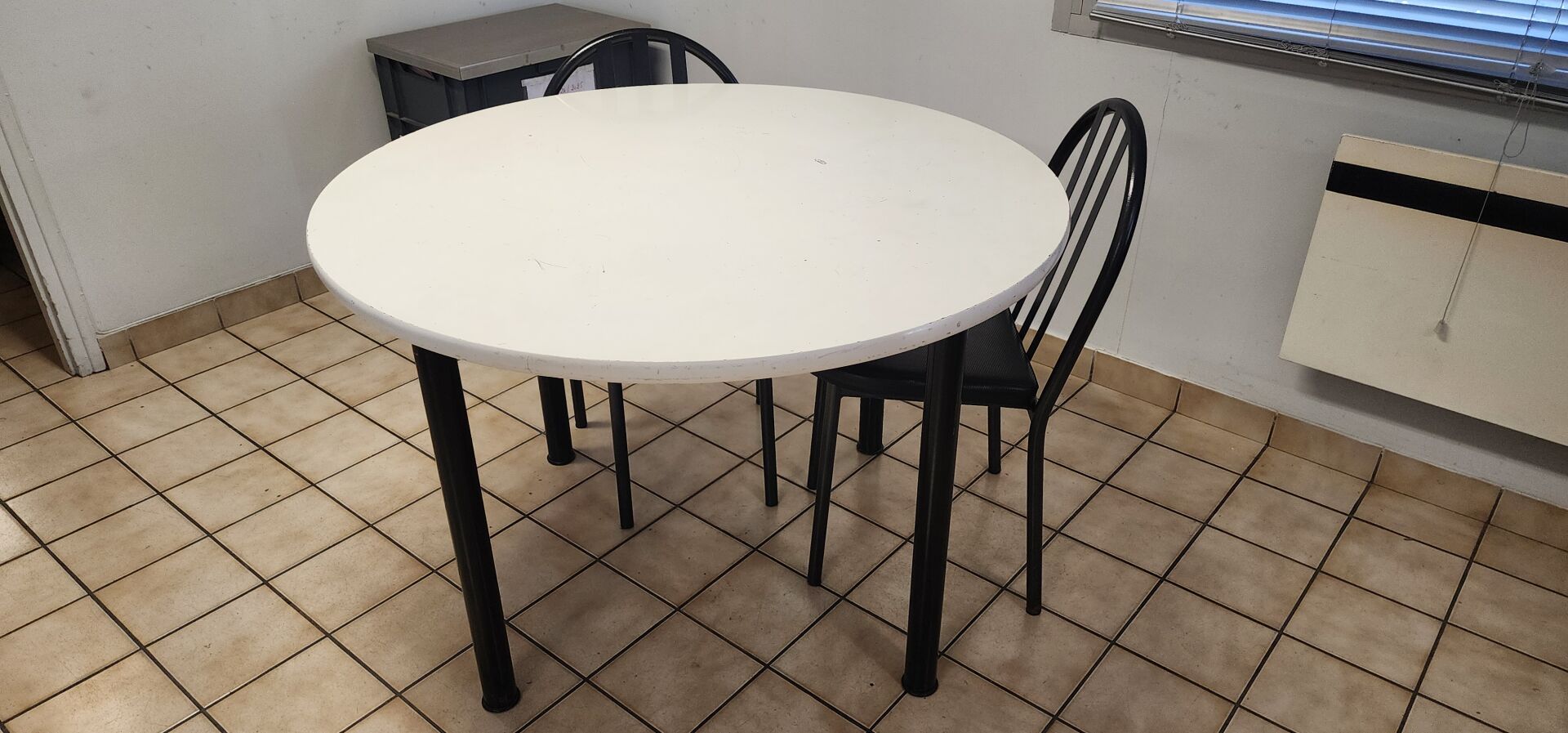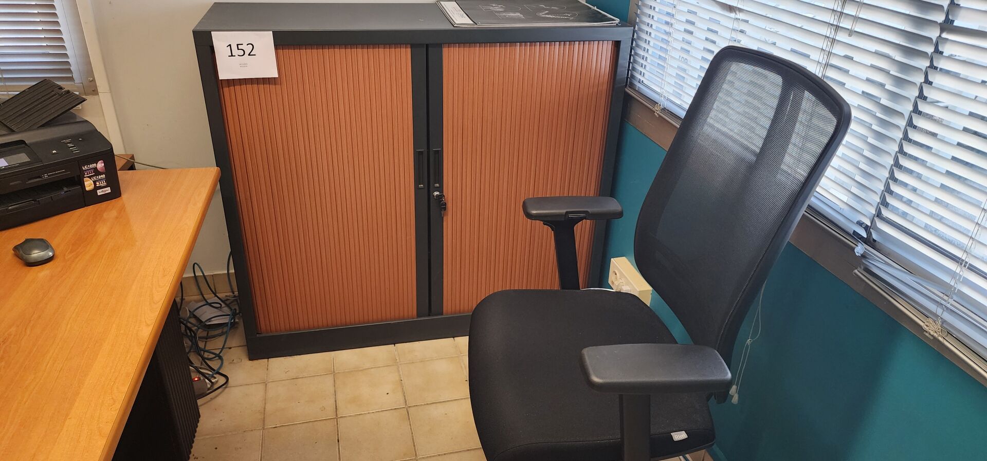 1 bureau mélaminé bois 160 x 90 cm 2 caissons mobiles assortis 1 meuble à hauteur d'appui métal à rideaux pvc 120 x 43 x 105 cm 1 fauteuil dactylo tissu noir 1 table ronde diam 110 cm et 2 chaises métal et simili cuir 1 présentoir métallique rouge