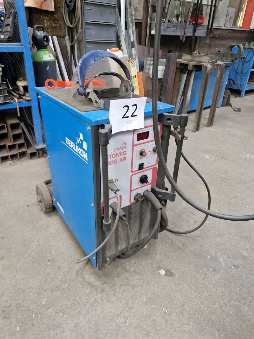 1 poste à souder OERLIKON Citomig 300XP S avec dévidoir DV4004 XP, n/s : 38840VE336 triphasé 1 établi mobile acier laqué bleu 160 x 90 x 168 cm avec potence, fabrication interne 2 meubles métalliques à 10 clapets 2 caisses à outils avec outillage 2 crics hydrauliques (l'un 3 tonnes)