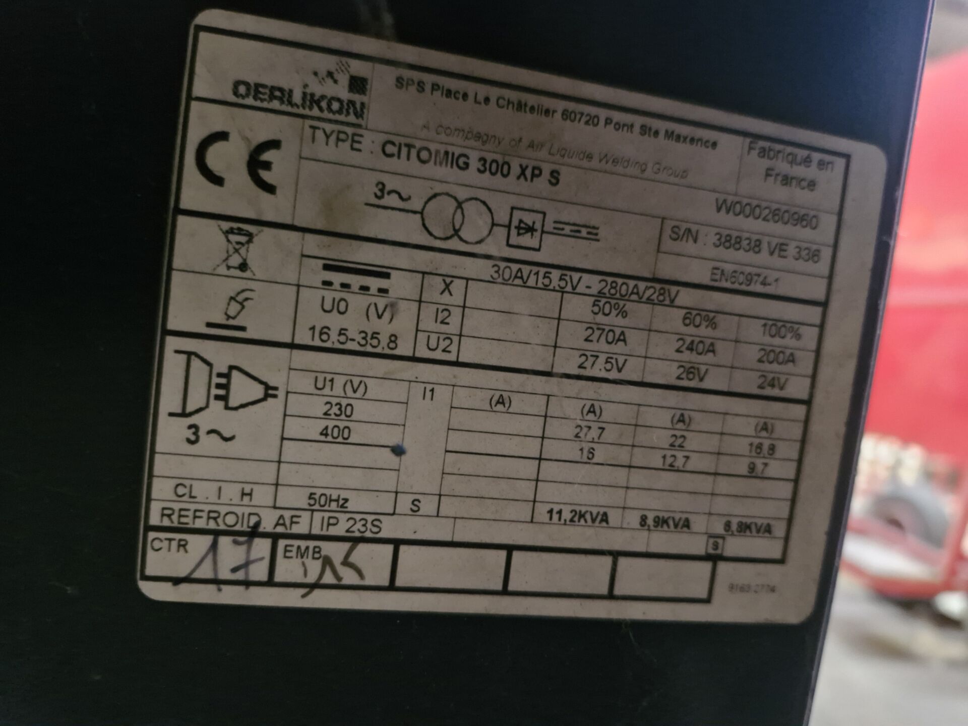 1 poste à souder MIG OERLIKON Citomig 300 XP, n/s : 3883BVE336 avec dévidoir OERLIKON DV 4004 XP 1 refroidisseur COMMERCY RF600 (fonctionnement non garanti)