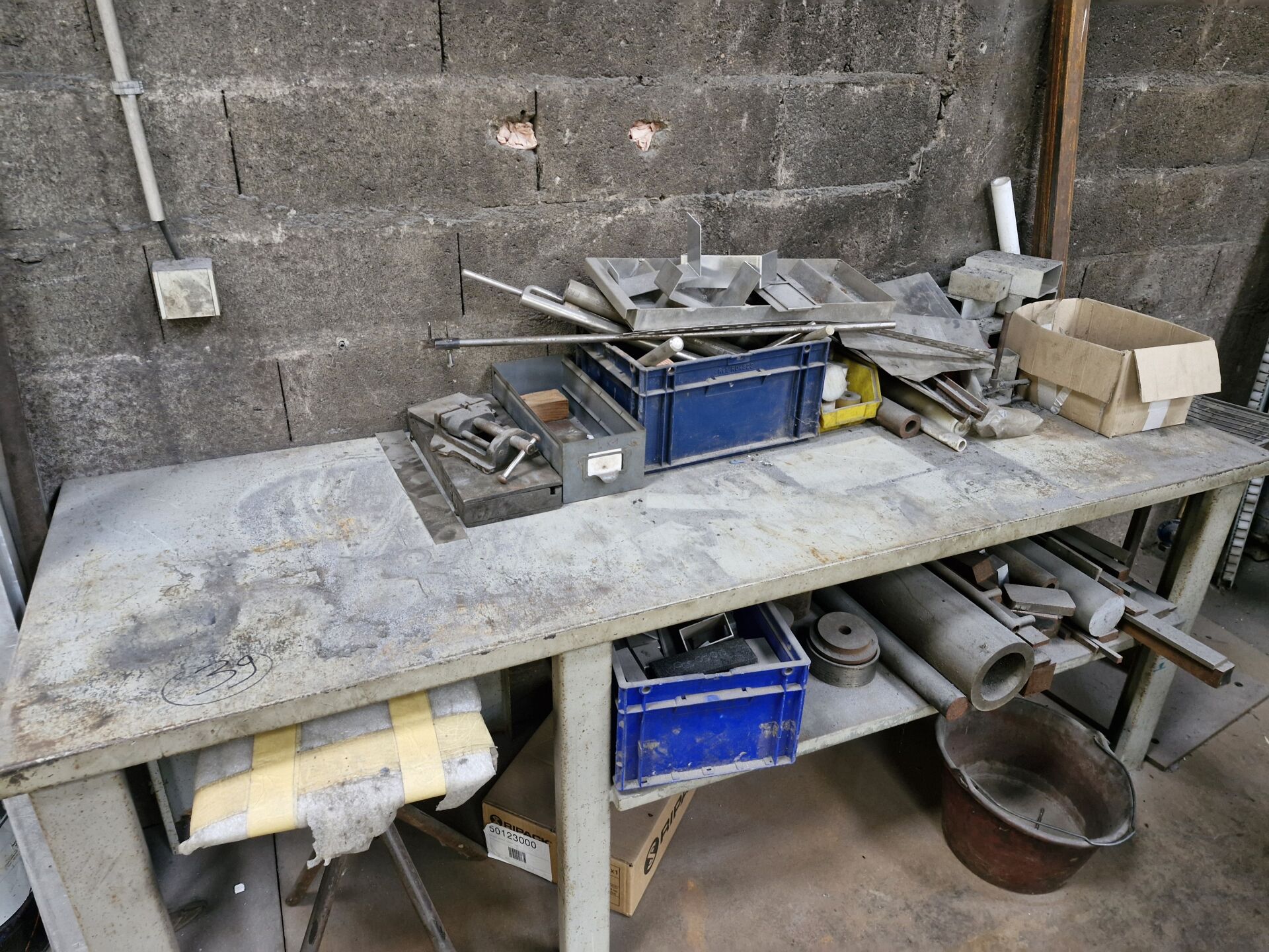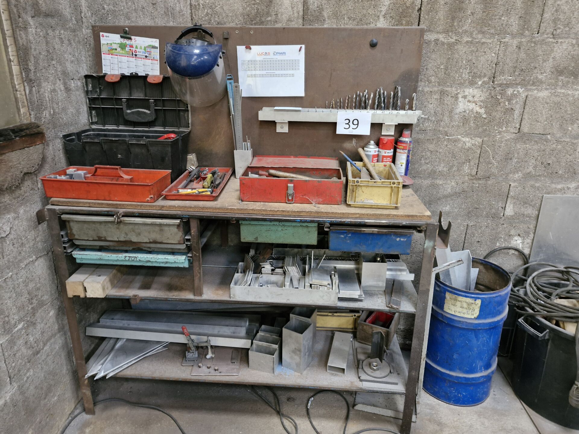 1 établi 150 x 60 cm comprenant outillage manuel, forets, chutes et cales alu et 1 table métallique 210 x 70 cm comprenant chutes de profils acier et alu, 1 serre-joint 3.50 m 1 desserte métallique 80 x 65 cm comprenant visserie, cales, cornière alu