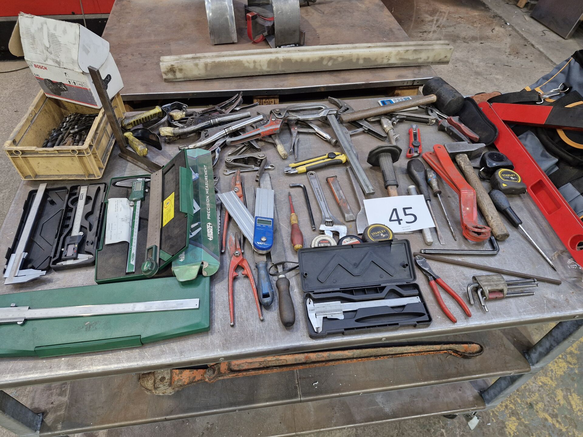 1 lot d'outillage manuel comprenant : 5 pieds à coulisse dont 2 digitaux, 1 équerre digitale, environ 8 pinces étaux, tournevis, pinces, cisaille, forets, 1 niveau à bulle, sacoche à outils RIPACK etc