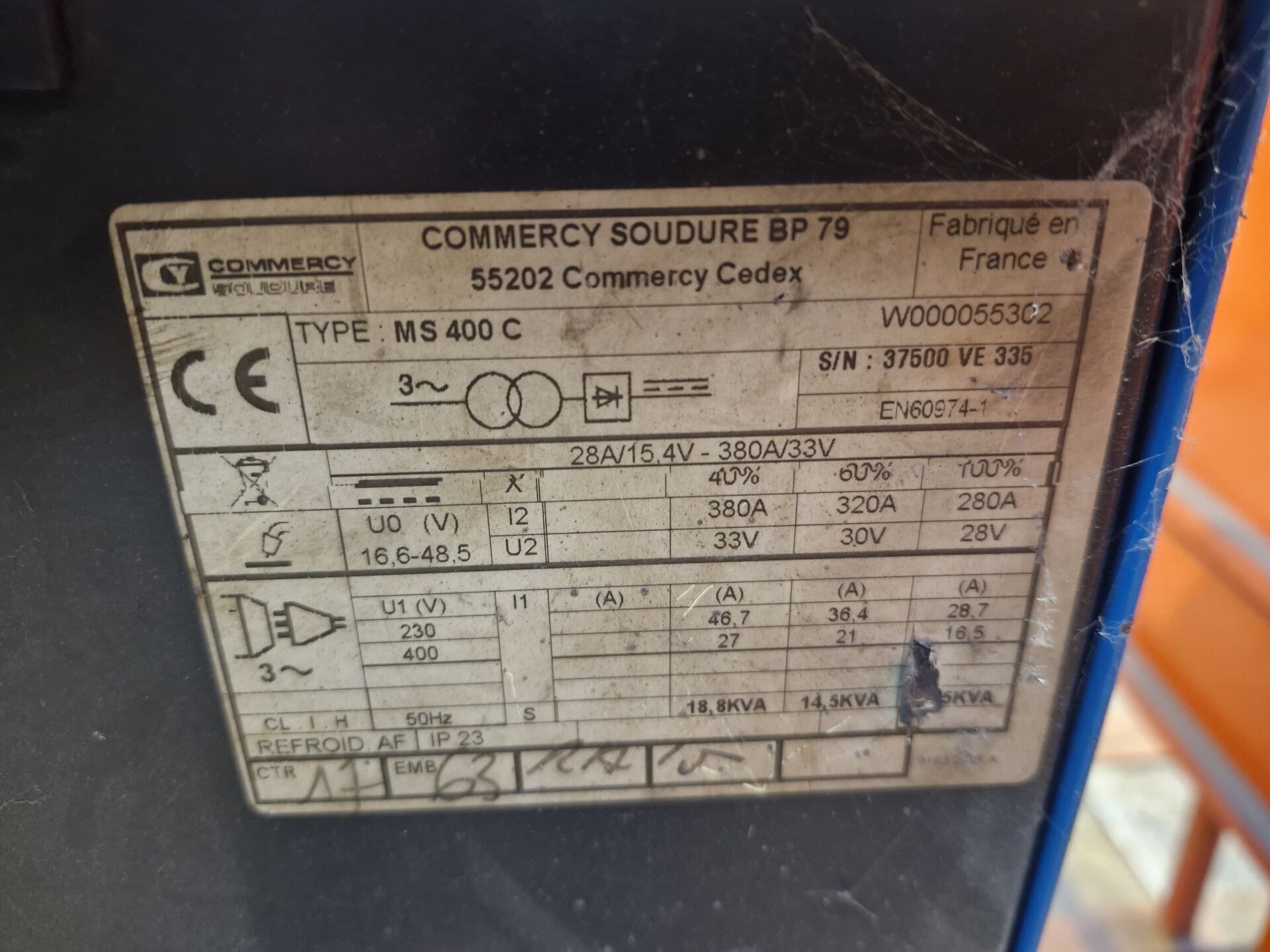 1 poste à souder COMMERCY MS400 Cymig, n/s : 37600 VE 335 triphasé , 1 casque